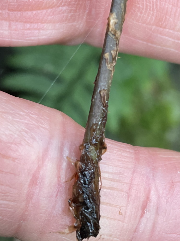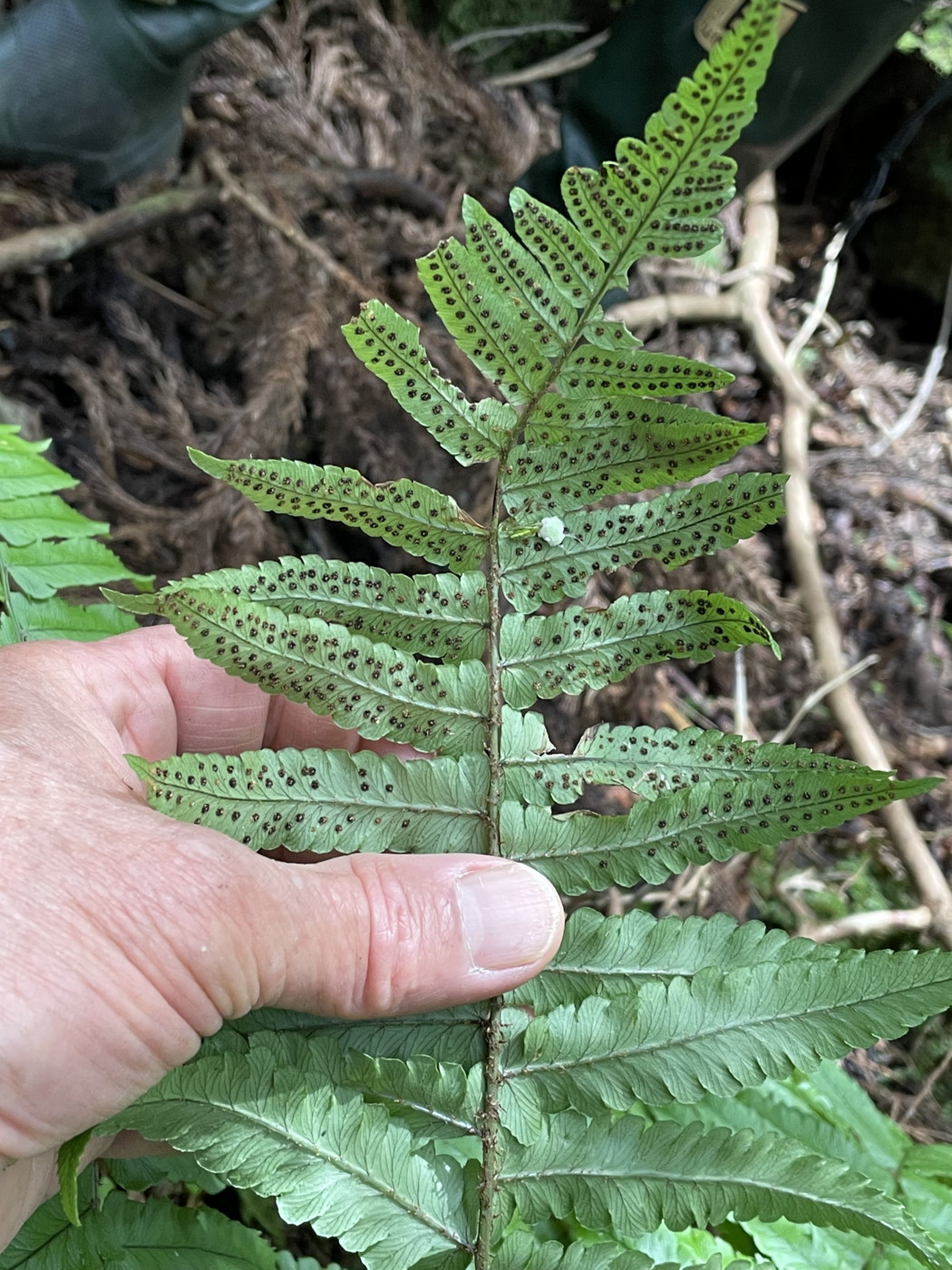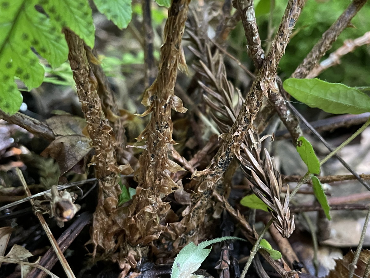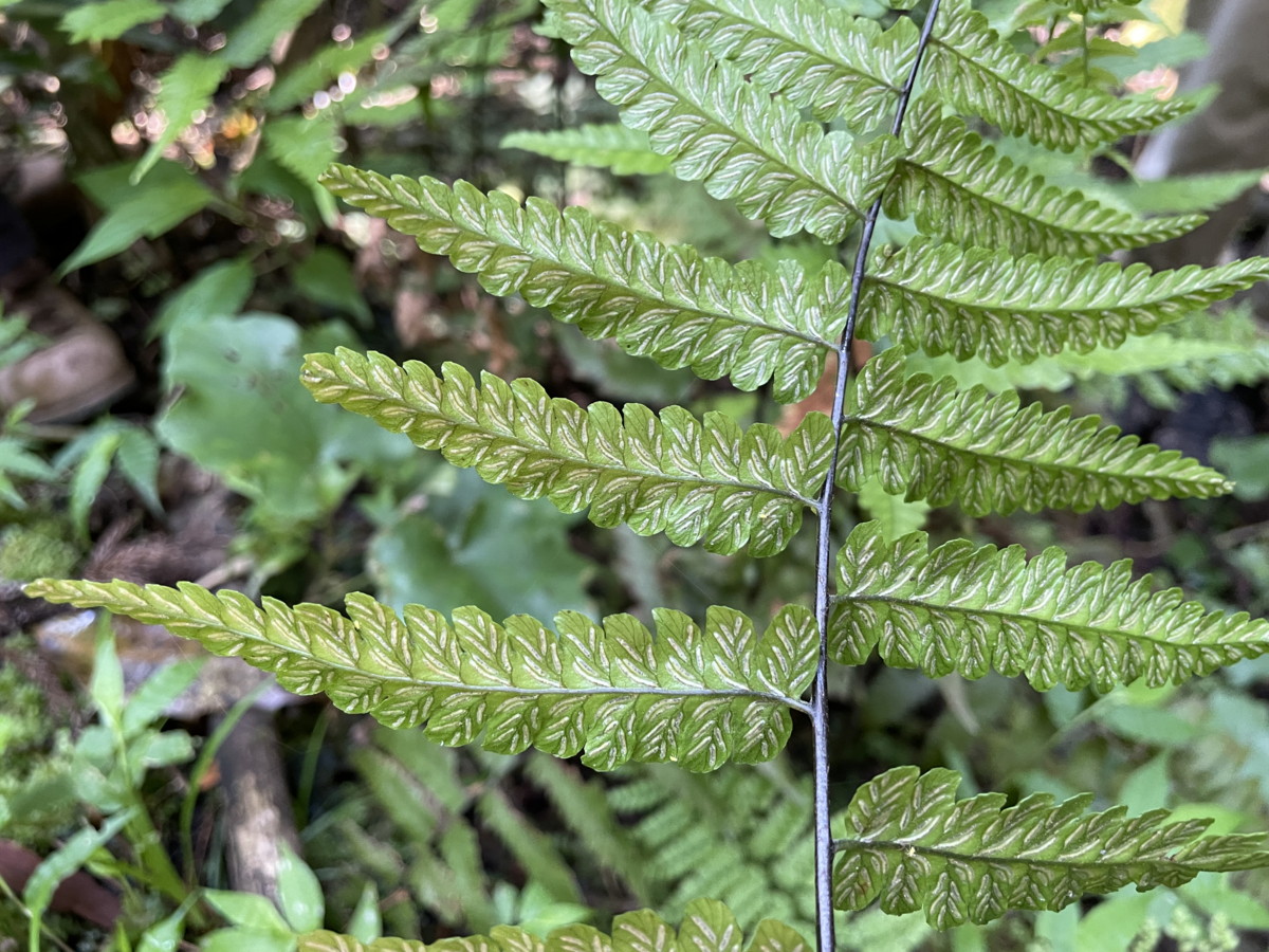 ウエットなスギ林林床に生育。小羽片基部上側の耳垂状の裂片が羽軸をあまり覆っていなかったので現地では同行の方々とカラクサイヌワラビあるいはオオカラクサイヌワラビ(カラクサイヌワラビ×ヒロハイヌワラビ)の可能性があると考えたが、胞子は正常でカラクサイヌワラビであった。