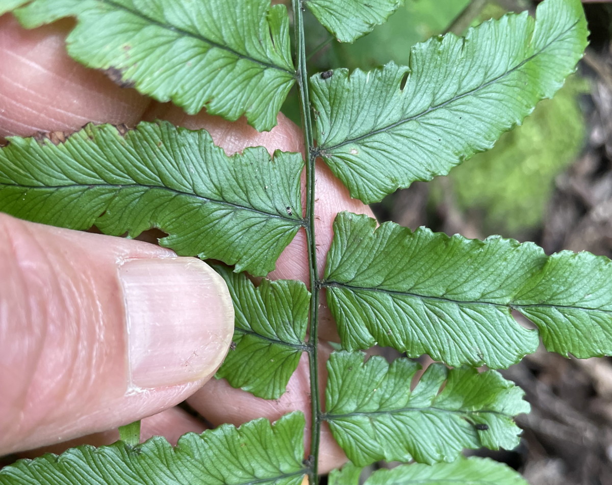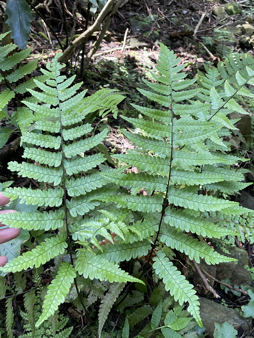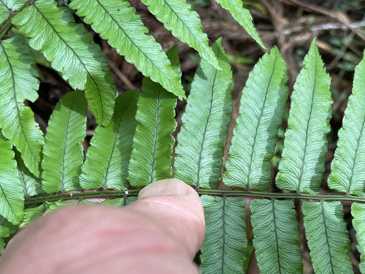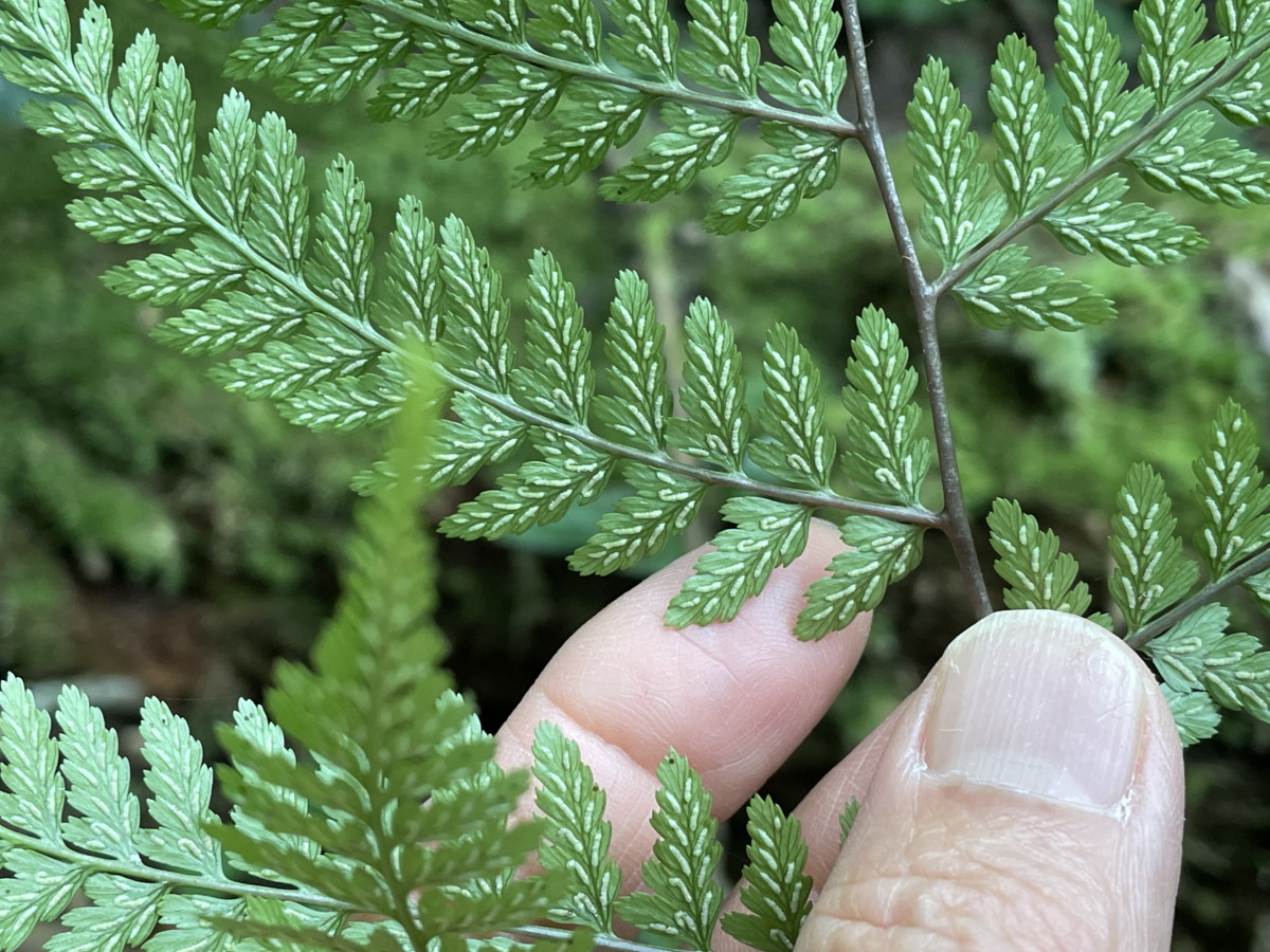 谷沿いのウエットなスギ林林床で観察。やや外観の異なる個体を2株観察した。結果はどちらもオオバノハチジョウシダであった。今回は状態のよいオオバノアマクサシダを観察できなかったが、また小羽片や小頂羽片のようすを比較してみたい。