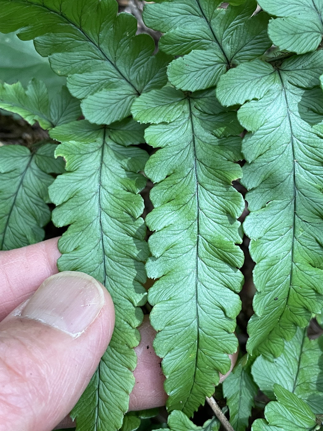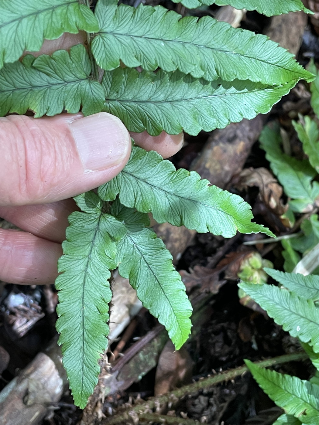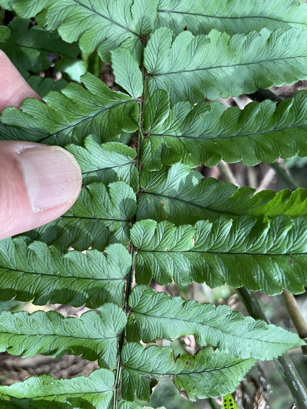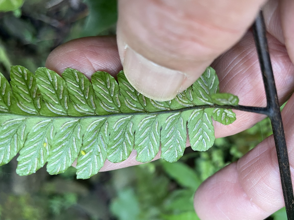 谷沿いのウエットなスギ林林床で観察。やや外観の異なる個体を2株観察した。結果はどちらもオオバノハチジョウシダであった。今回は状態のよいオオバノアマクサシダを観察できなかったが、また小羽片や小頂羽片のようすを比較してみたい。