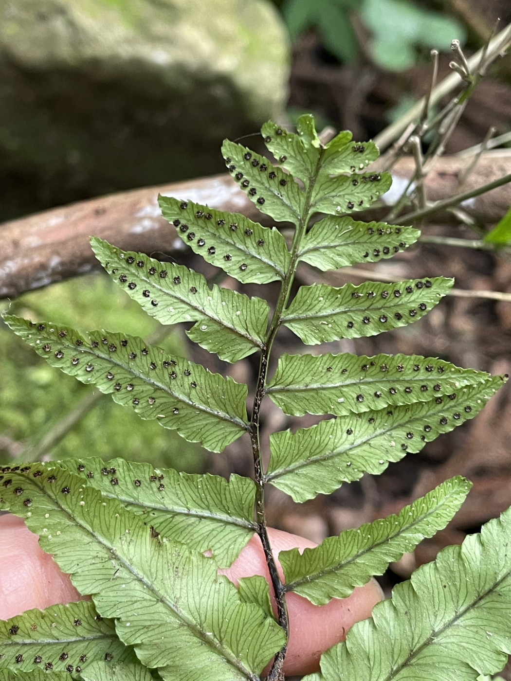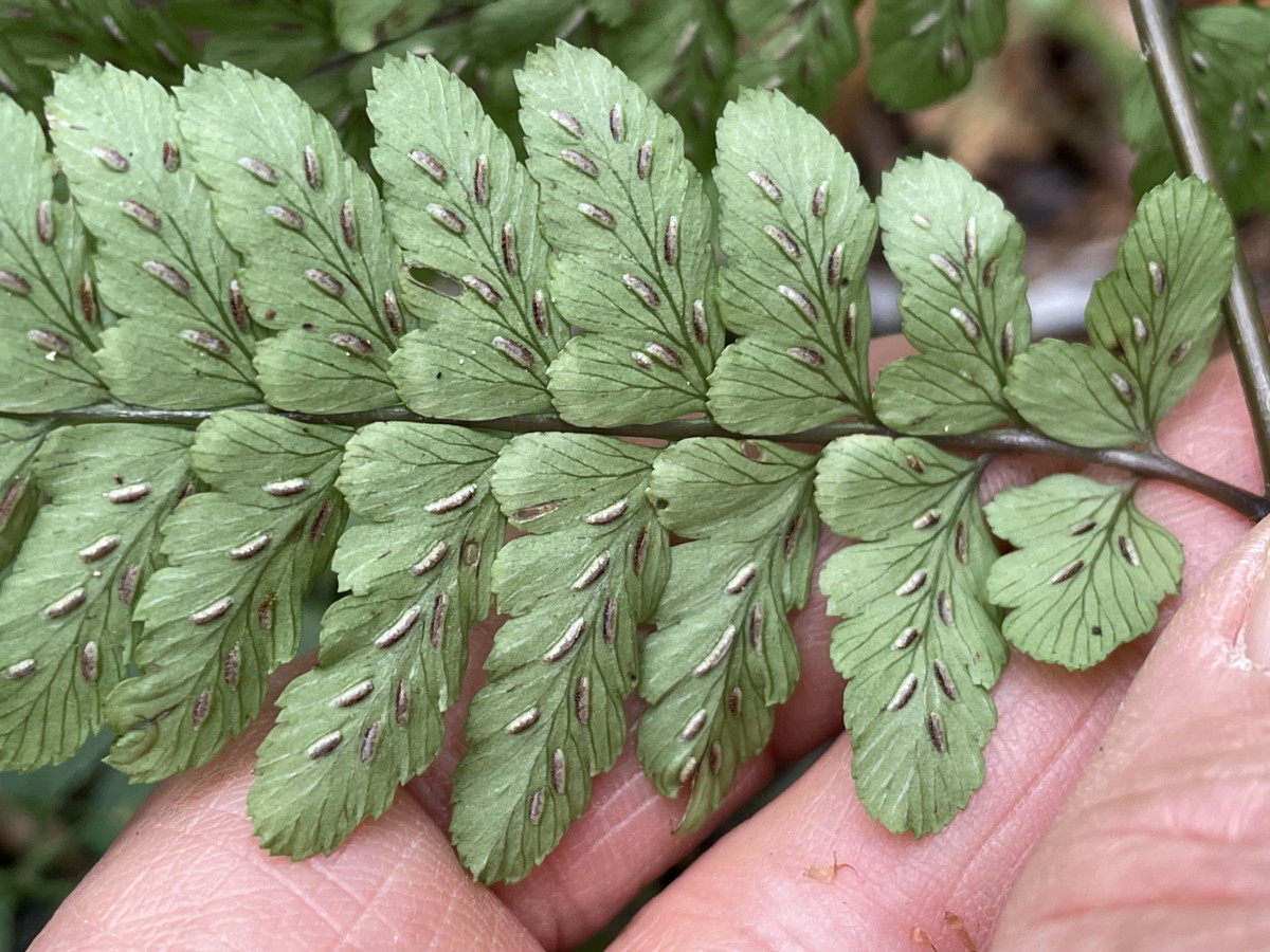 (2)羽片基部が広い楔形のオオクジャクシダ、胞子嚢群