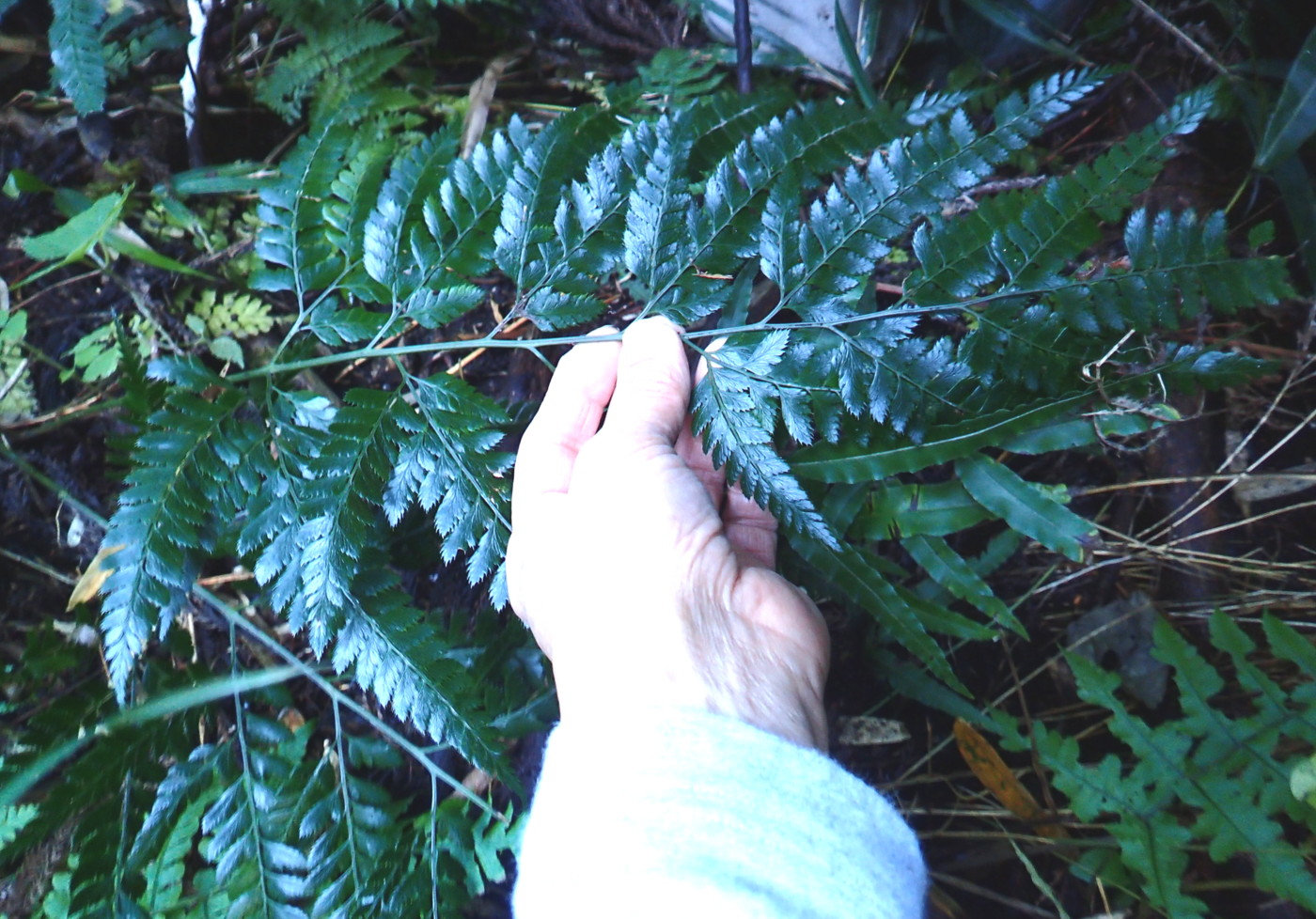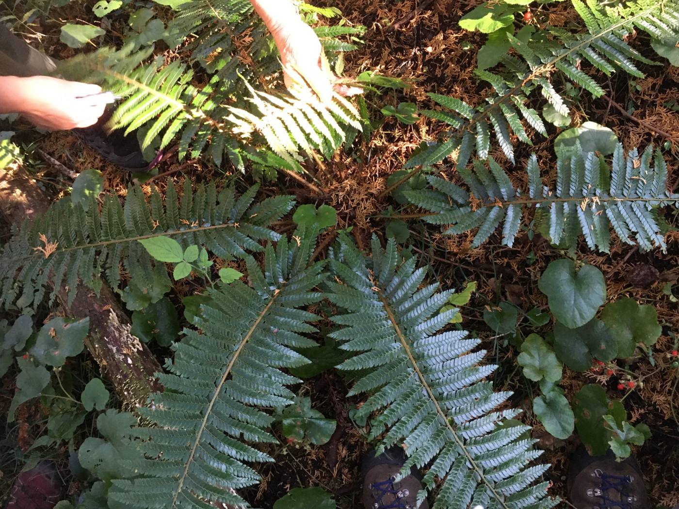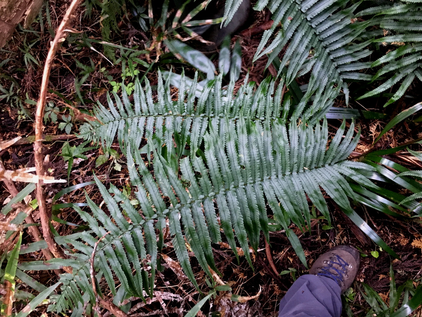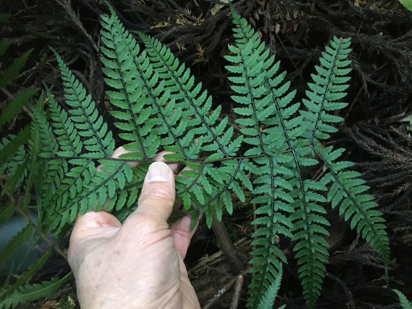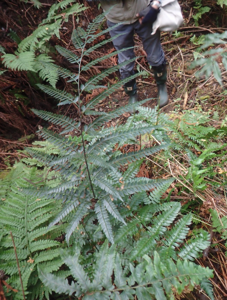 写真の個体は成長した大きなオオカナワラビです。長さは80~90㎝。柄や中軸は黒味を帯びた臙脂色。林床から葉を立ち上げていました。「育ちのよいオオカナワラビ」(同行の方の表現)と一般的に普通のオオカナワラビとは外観がだいぶ異なります。