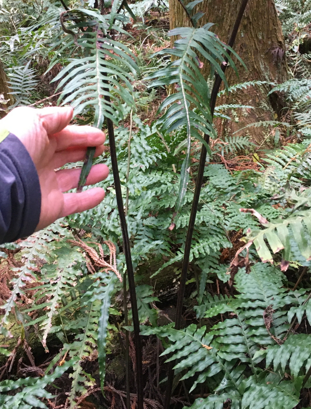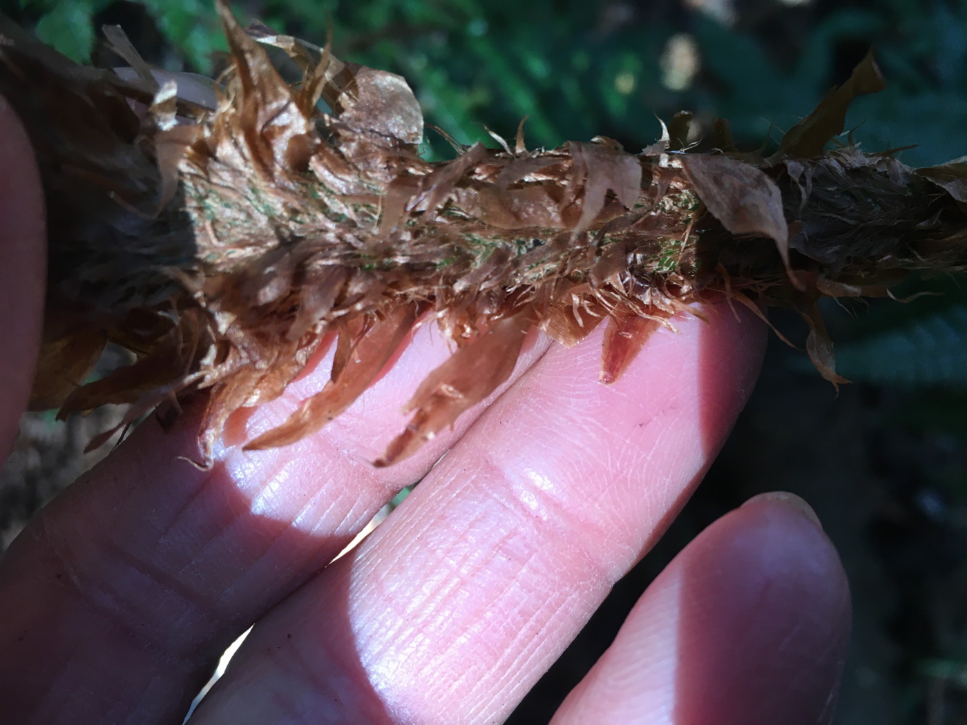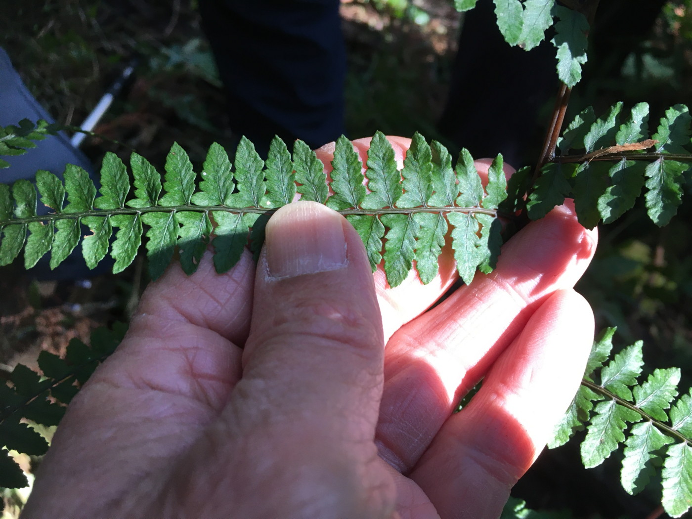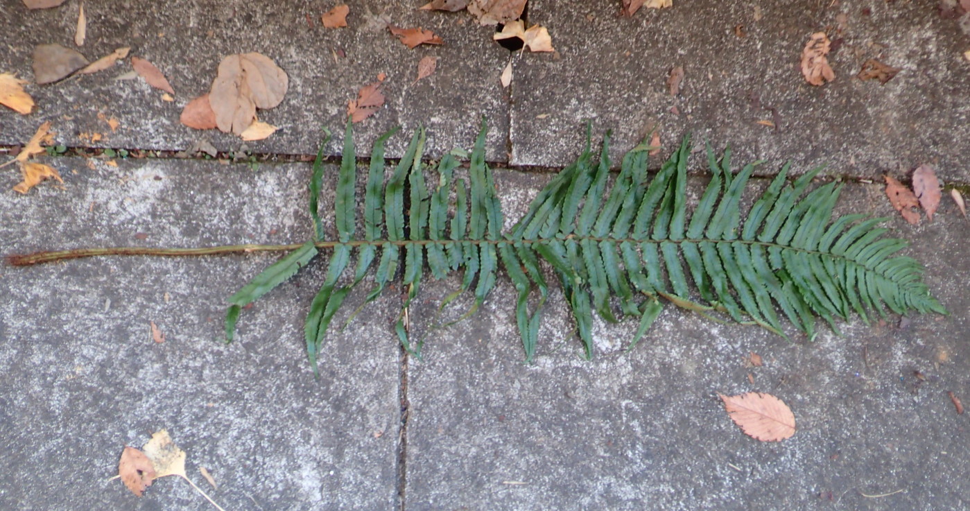 葉の大きさは80㎝。葉身下部は下を向き、やや短縮する。中軸下部の鱗片には明瞭な棘上の突起がまばらにつく。同行の方から教えていただきましたが、イワヘゴの秋葉も明るい黒褐色になるとのこと、この季節、鱗片だけではイヌイワヘゴとの区別が難しくなるとのことでした。