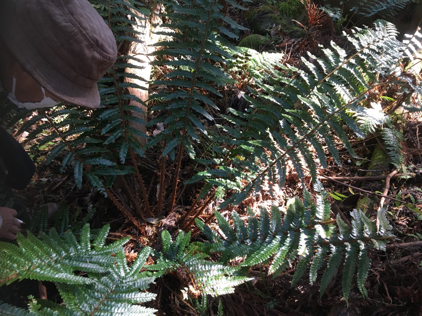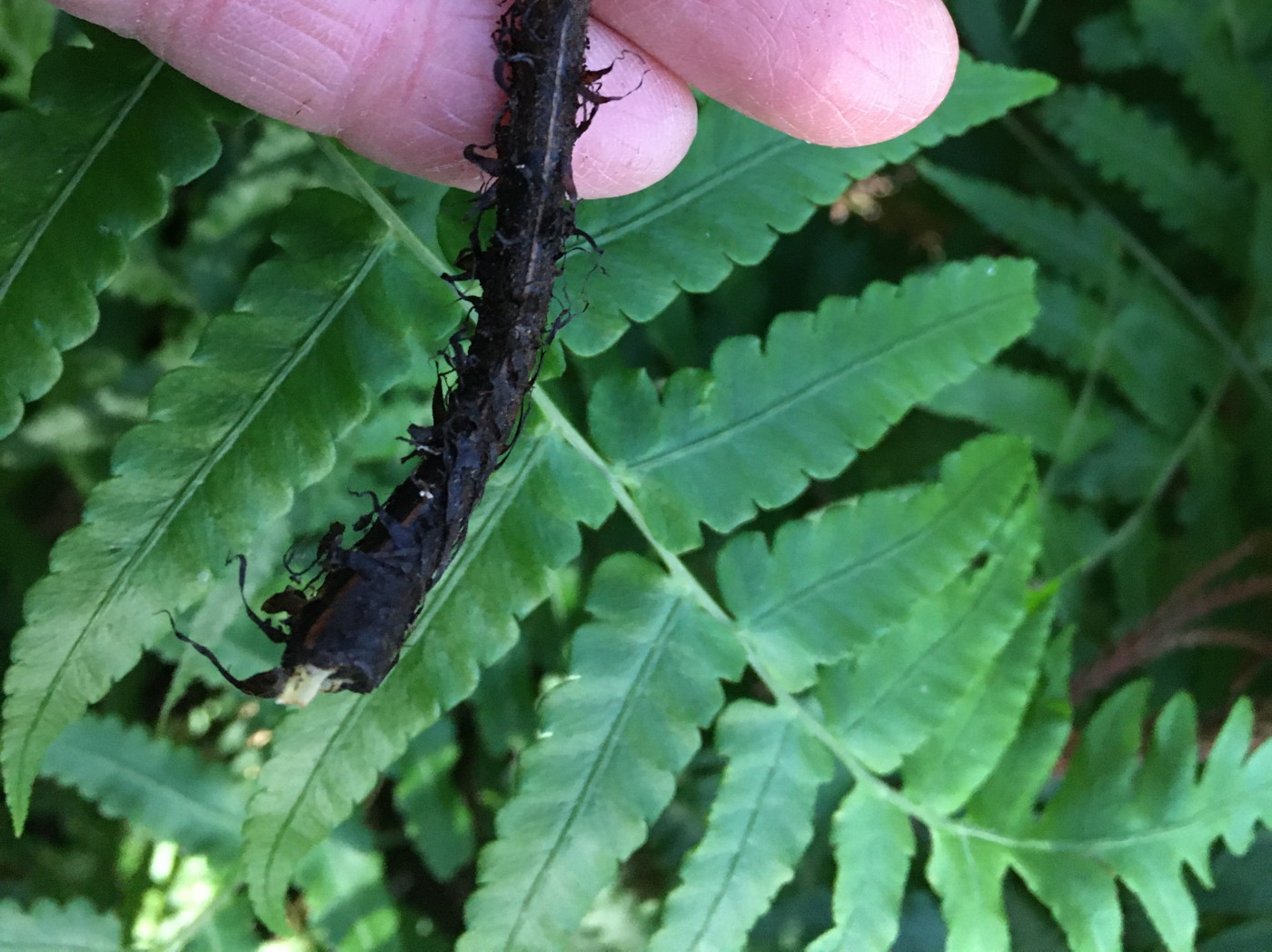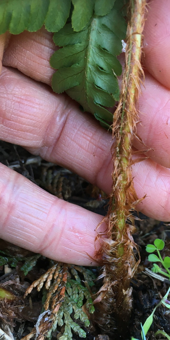 葉は1mほどで大形になる。葉身下部はあまり短縮しない。鱗片はイワヘゴよりも明るい黒褐色。中軸の鱗片にはほとんど棘状の突起が見られなかった。同行の方から、イワヘゴの可能性もあるので注意して観察するようにアドバイスを頂きました。