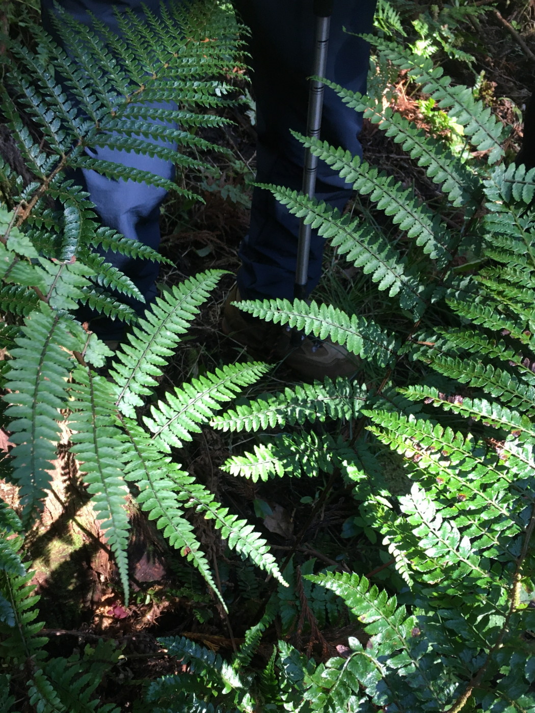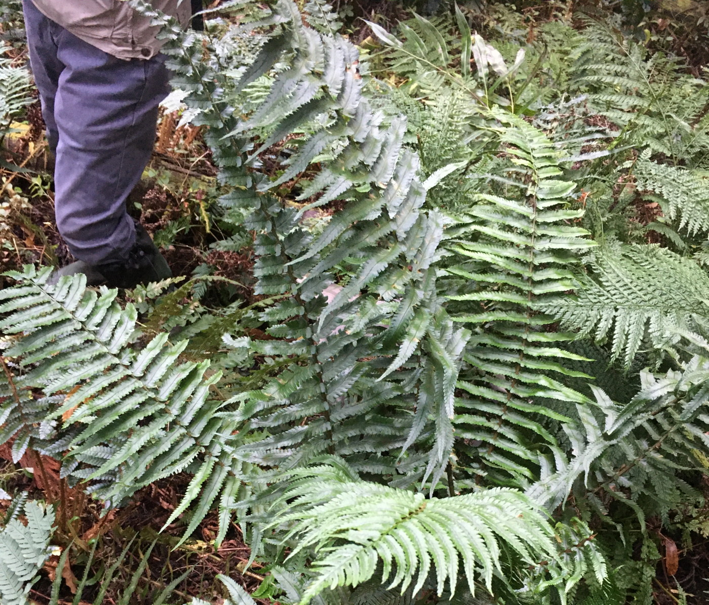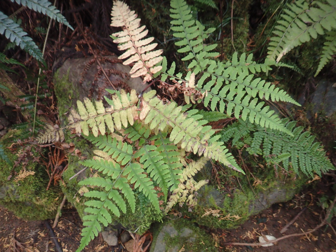 葉は1mほどで大形になる。葉身下部はあまり短縮しない。鱗片はイワヘゴよりも明るい黒褐色。中軸の鱗片にはほとんど棘状の突起が見られなかった。同行の方から、イワヘゴの可能性もあるので注意して観察するようにアドバイスを頂きました。