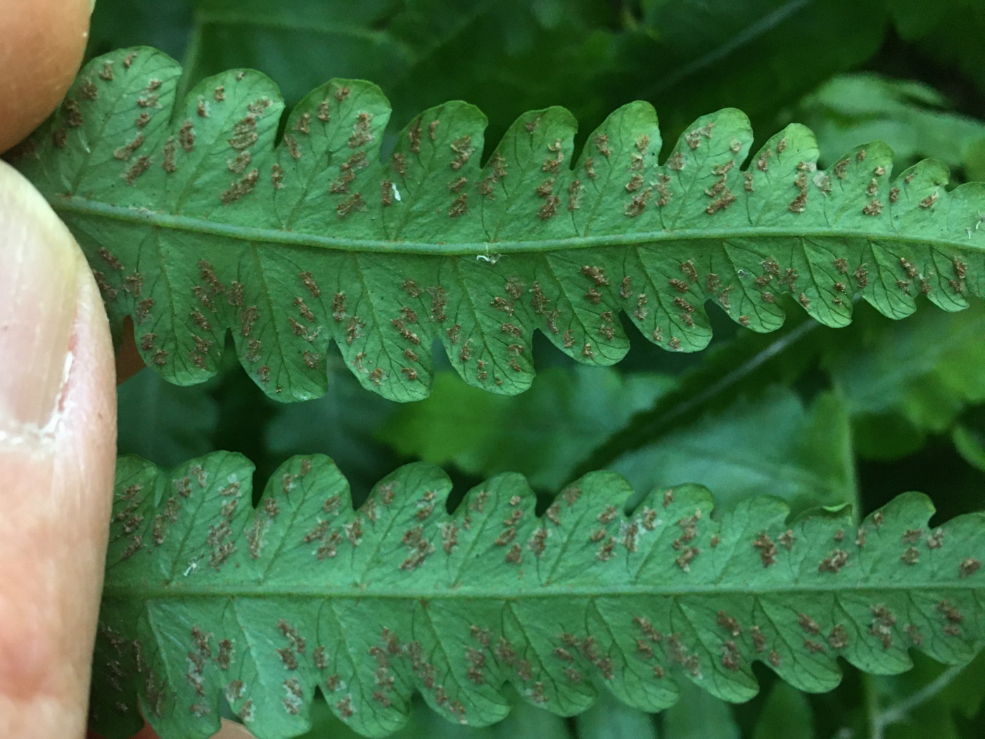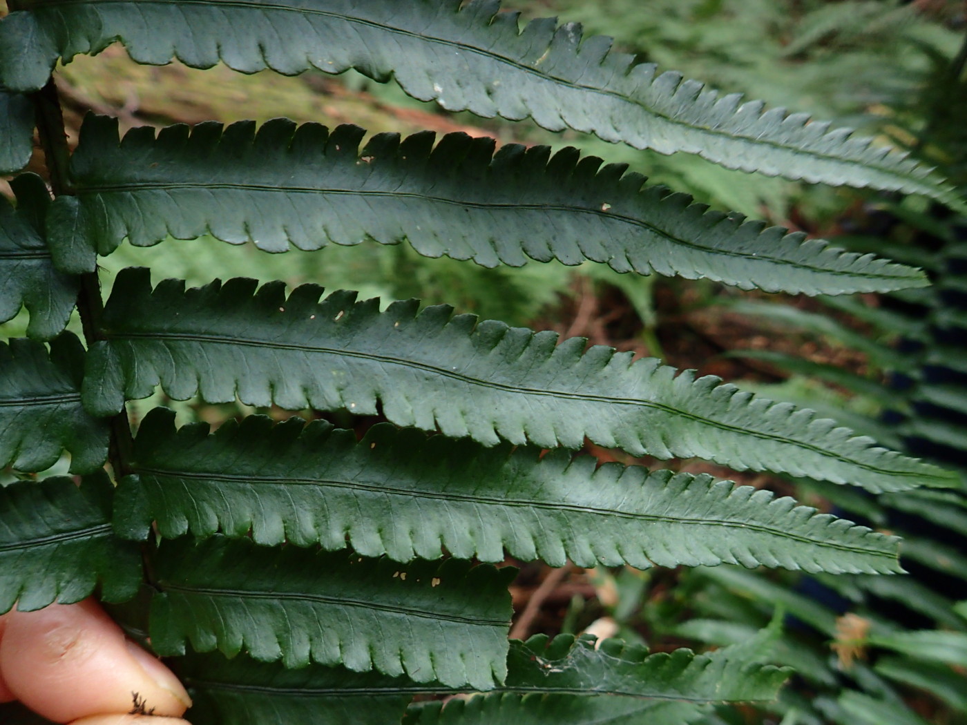 胞子を調べていないのではっきりしたことはわかりません。ヤマグチカナワラビ(オオカナワラビとミドリカナワラビの雑種)か、葉の幅の広いオオカナワラビの可能性があります。葉は60~80㎝、厚みがあるが柔らかく濃緑色で光沢あり。葉身の幅が広く、下部の羽片は長く上部に行くに従い短くなり頂羽片は典型的なオオカナワラビほど明瞭ではありません。羽片基部上側の小羽片はミドリカナワラビに似て柄が長く「小羽片の耳の出方がなだらかで優しい感じ」(ミドリカナワラビの小羽片の説明がぴったりだったのでそのままネットから引用させていただきました。)が表れているように思いました。同行の方から、この個体の包膜の辺縁には鋸歯が確認できたとのご連絡を頂いています。