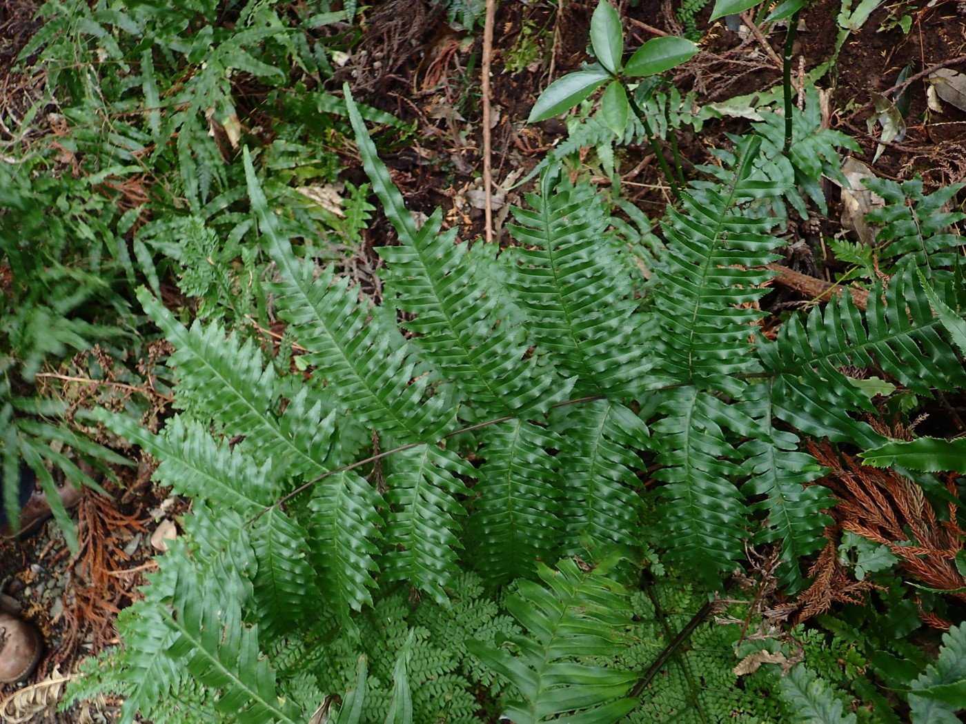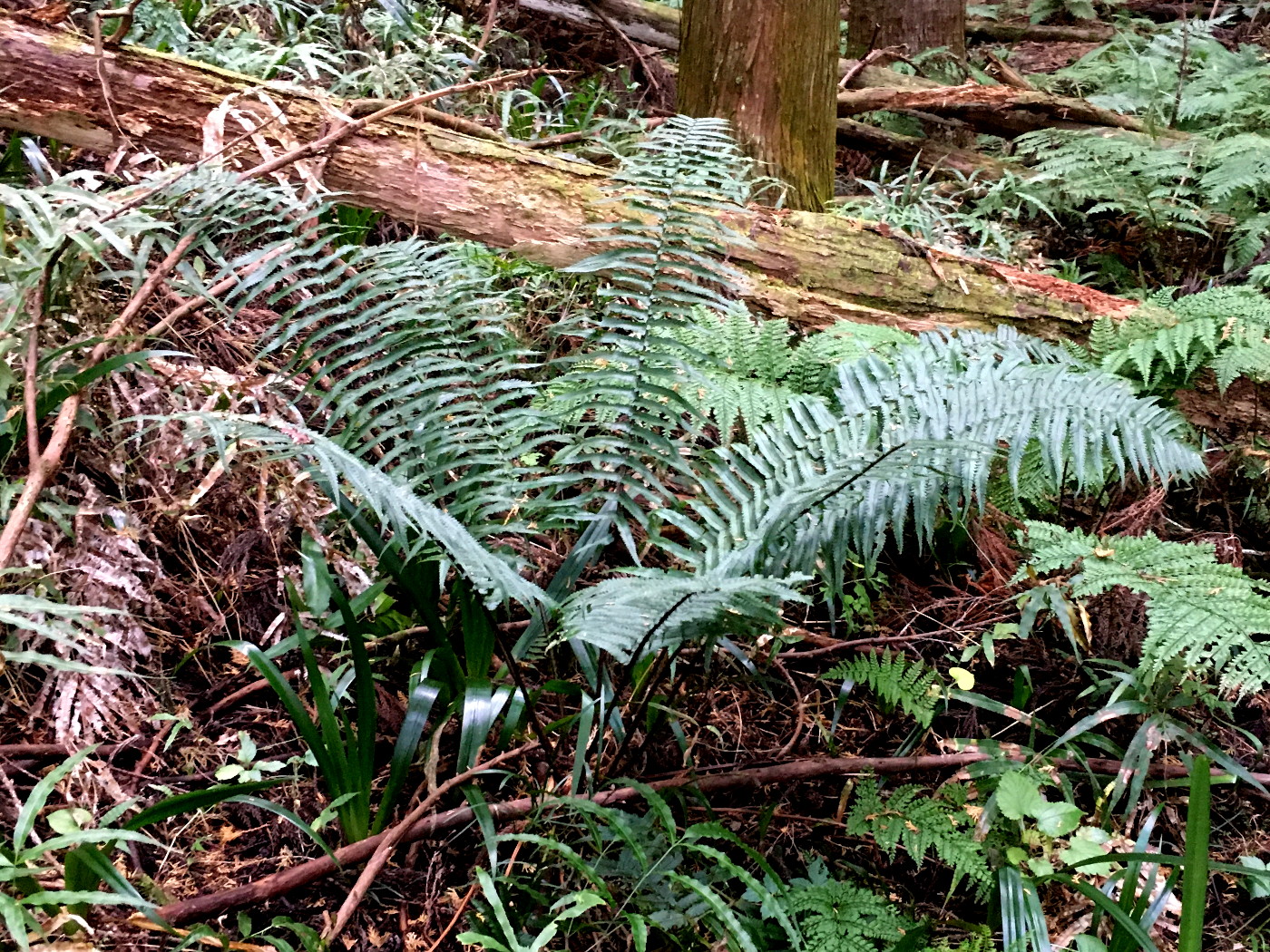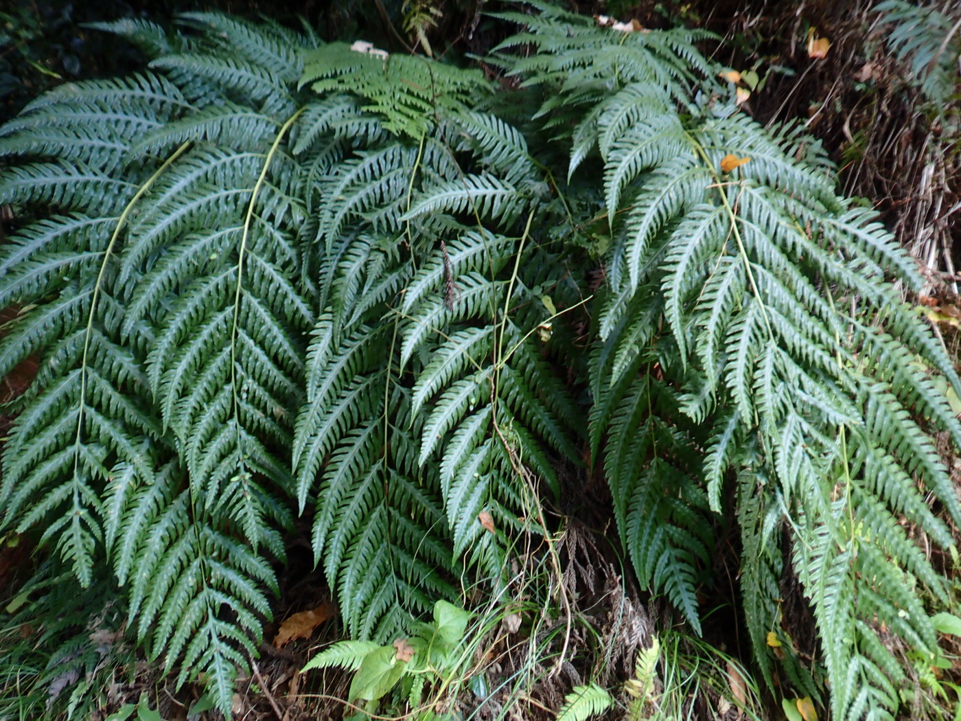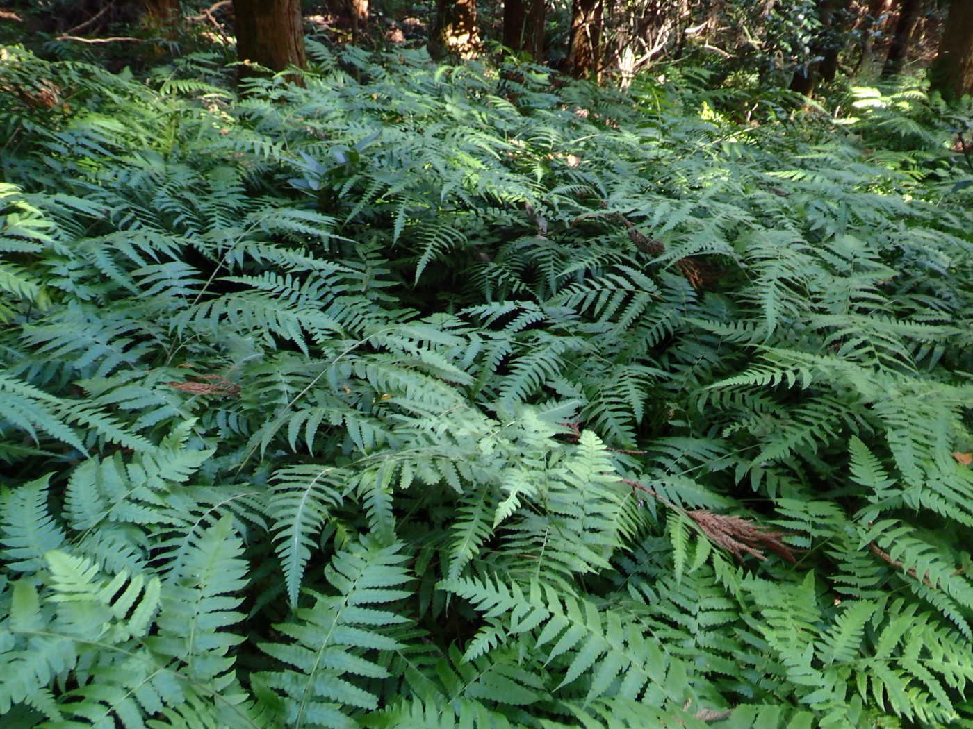 イノデとアイアスカイノデの雑種と推定される。スギ・ヒノキ林林床。イノデやアイアスカイノデが生育する林床の中で、大きく目立つ存在である。