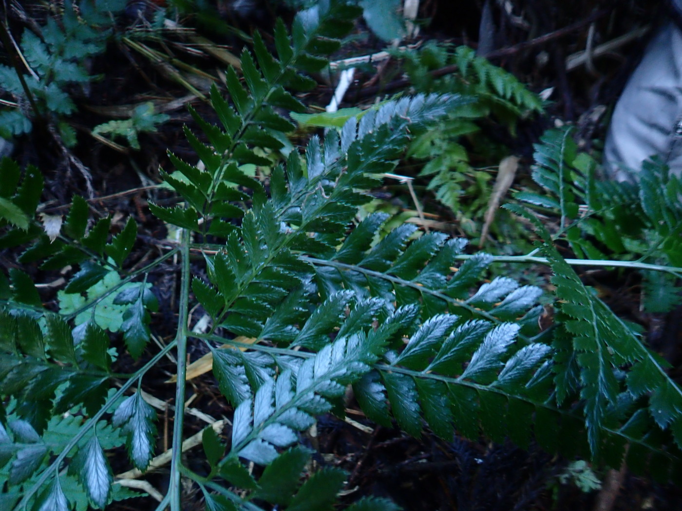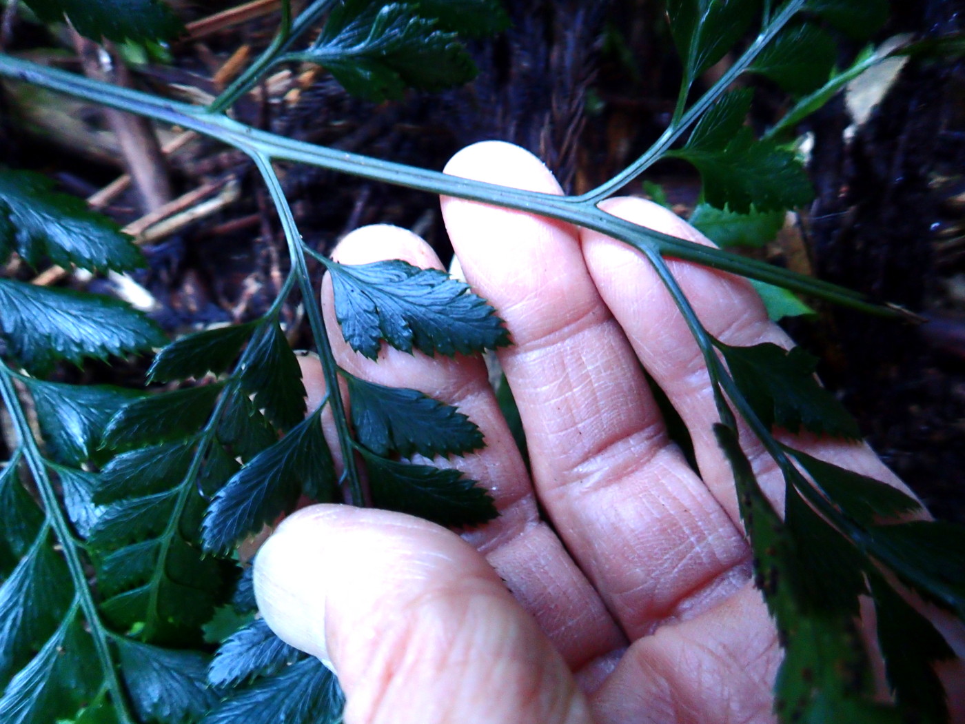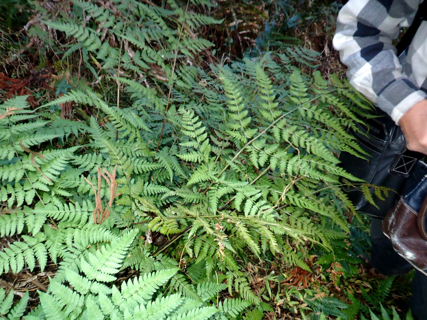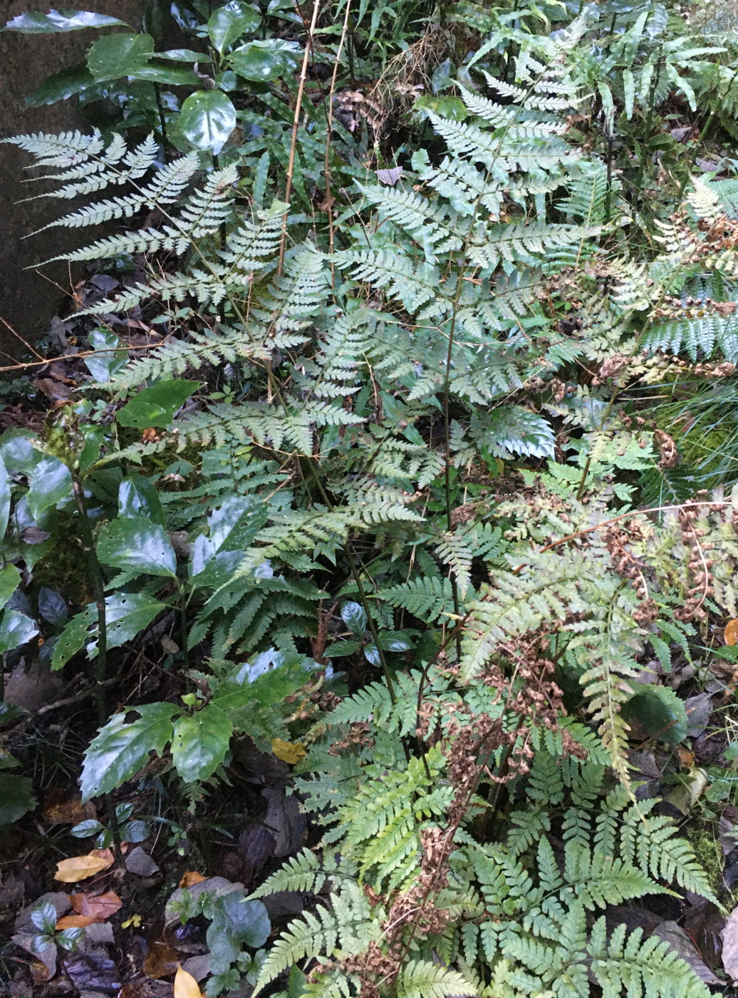 最近切り払われた林縁の森の林床に生育。よく日の当たるところに元気よく生育していた。日当たりがよいせいか、葉の色は黄緑色。最近出た「秋葉」で胞子嚢群もまだ色づいていない。同行の方にオクマワラビやイワヘゴの秋葉について詳しく教えていただきました。オクマワラビの鱗片は一般に黒褐色であるが秋葉の鱗片は明るい色になるので注意して観察するように、とのことでした。確かに明るい褐色をしていて、クマワラビの鱗片のようでした。写真には写っていませんが倒伏した古い葉の葉柄の鱗片は黒褐色でした。