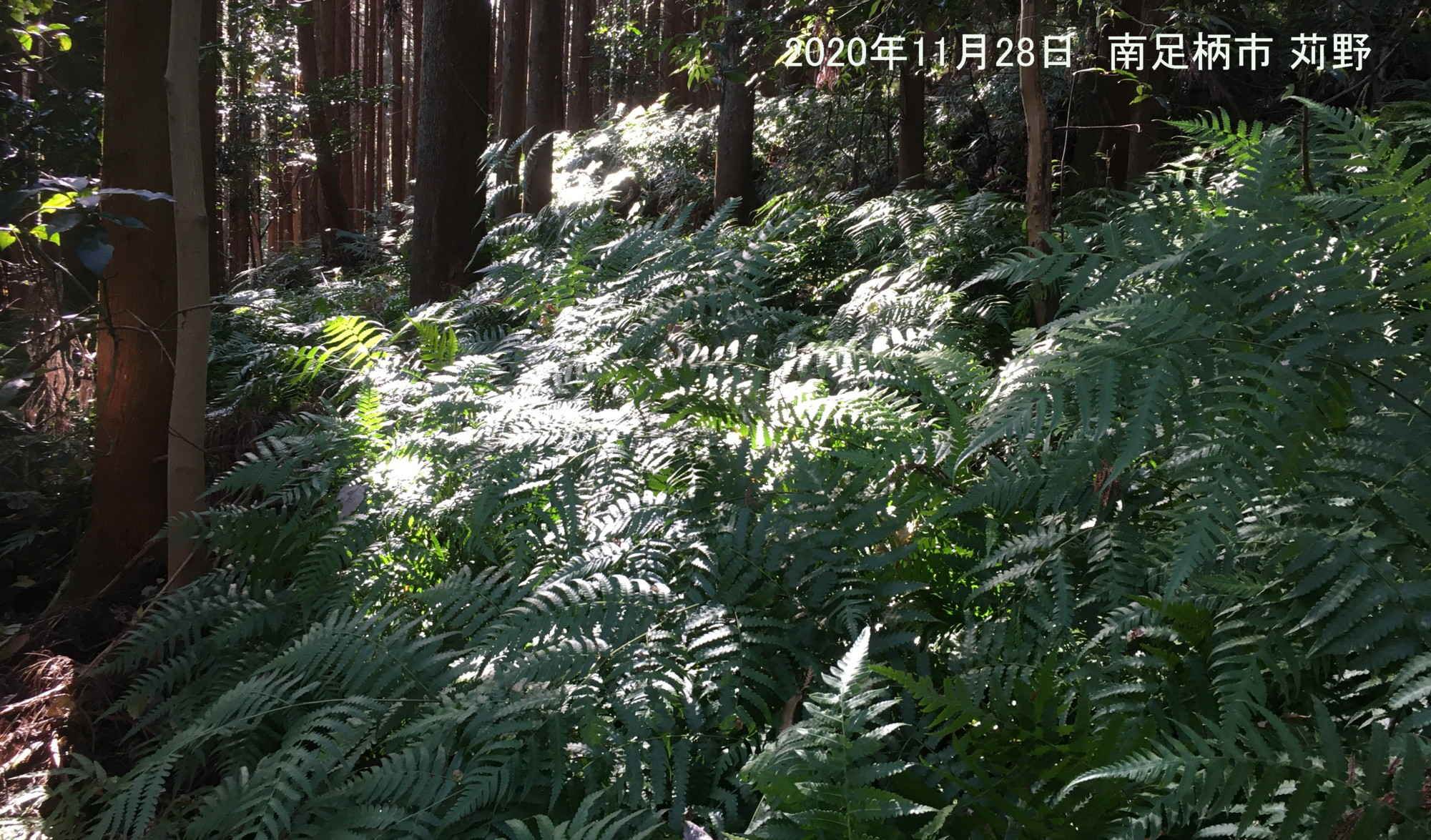 良い天気で風も穏やかで絶好の観察会日和でした。大雄山の北、苅野の森を皆さんで歩きました。シカの食害を心配したのですが、イノデなど葉身の上半分を食べられていたりしましたがいろいろなシダを観察することができました。帰りにはこの地域で採れたみかんを頂きました。2020年11月28日