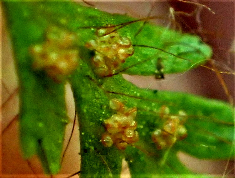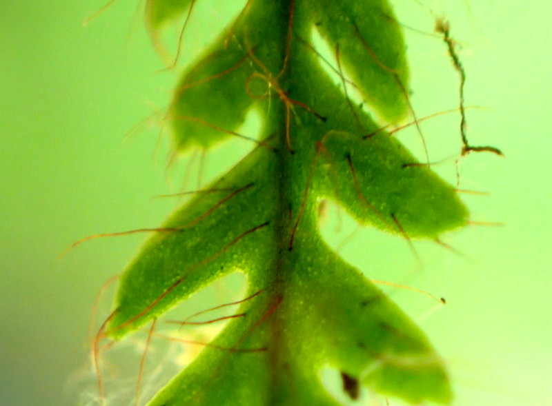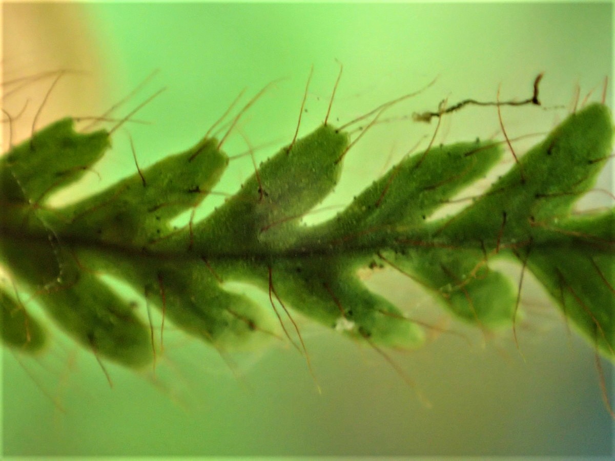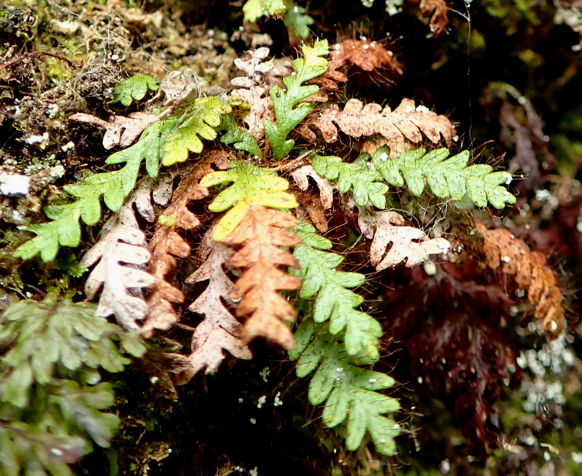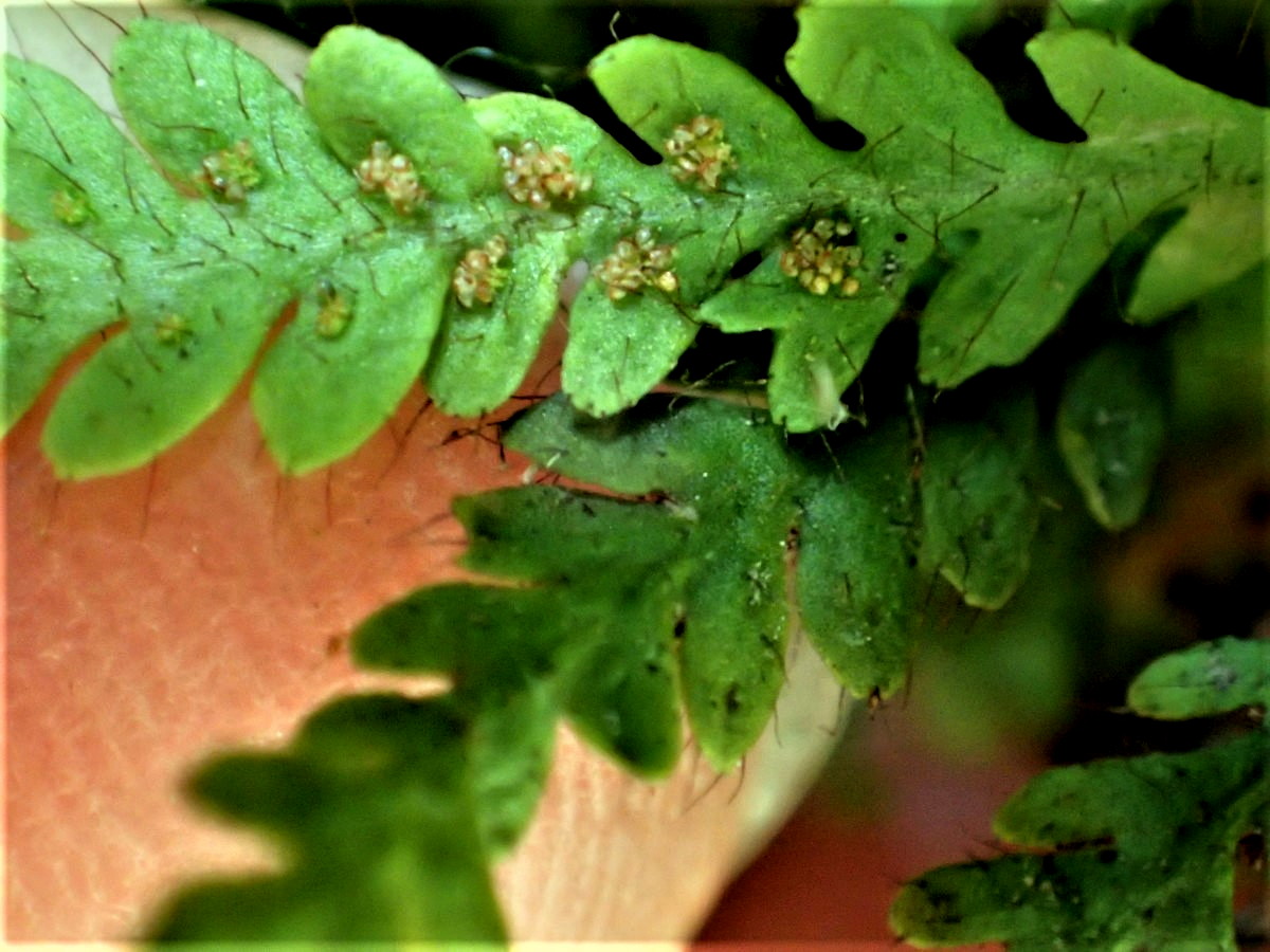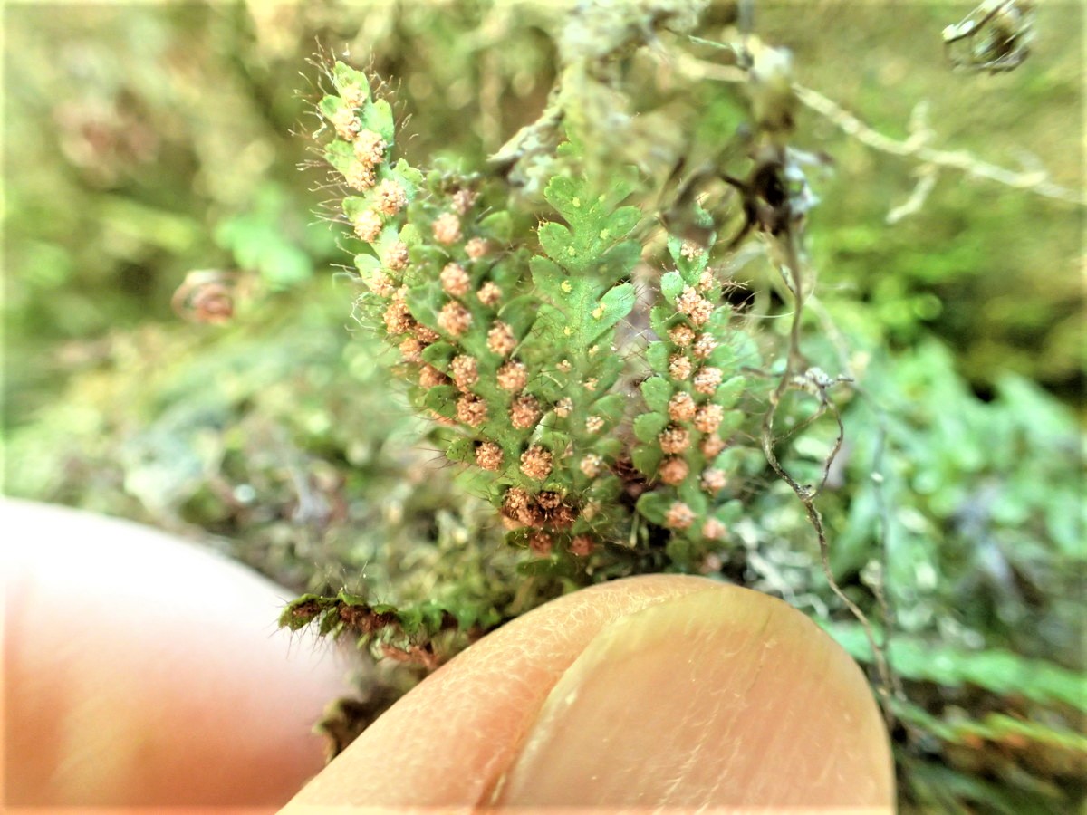 観察された特徴:常緑性。1~2cmの長さの葉を叢生してつける。葉は単葉で深裂し、葉の両面には長い毛が密に生える。胞子嚢群は中間につく。