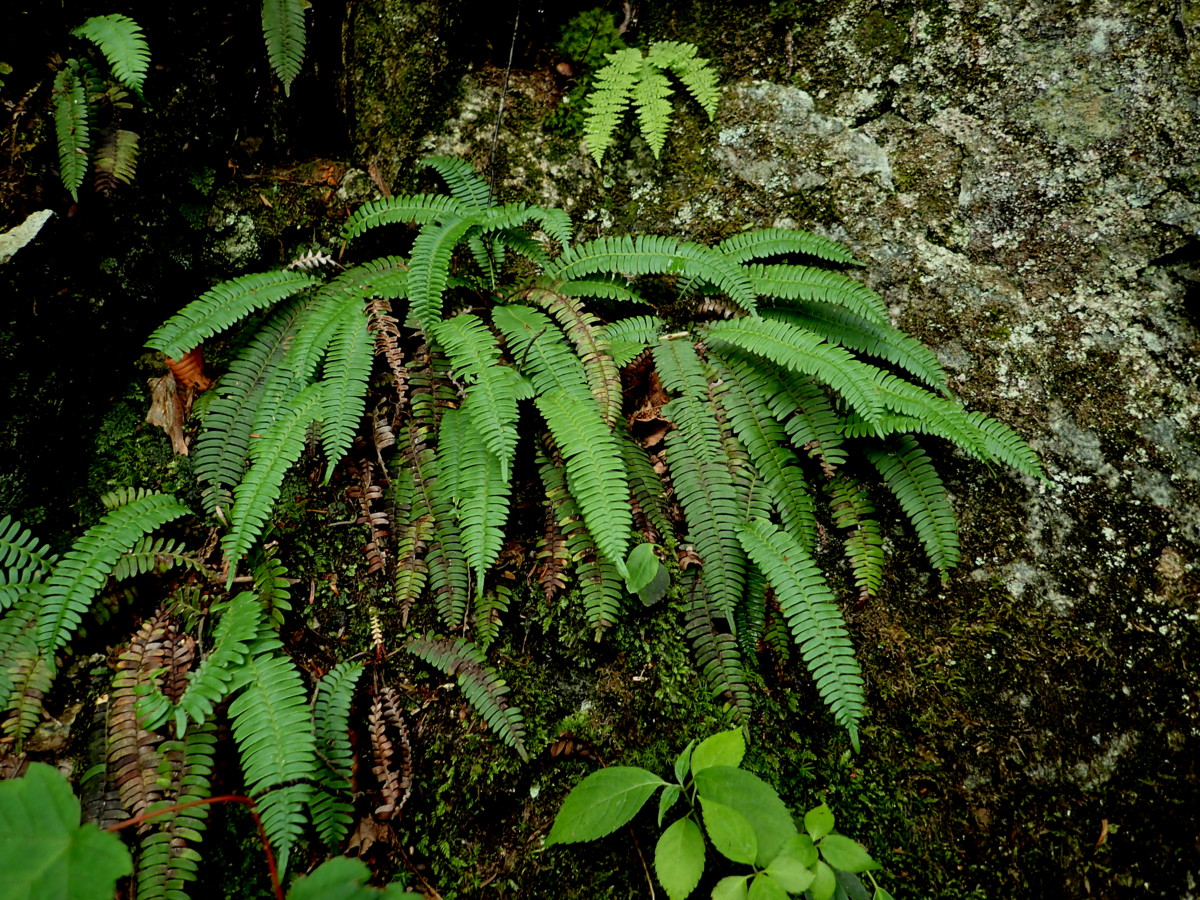 生育している環境:夏緑広葉樹林に覆われた渓谷沿いのあまりウエットではない岩壁や岩棚の上、岩が風化した崖などに群生。