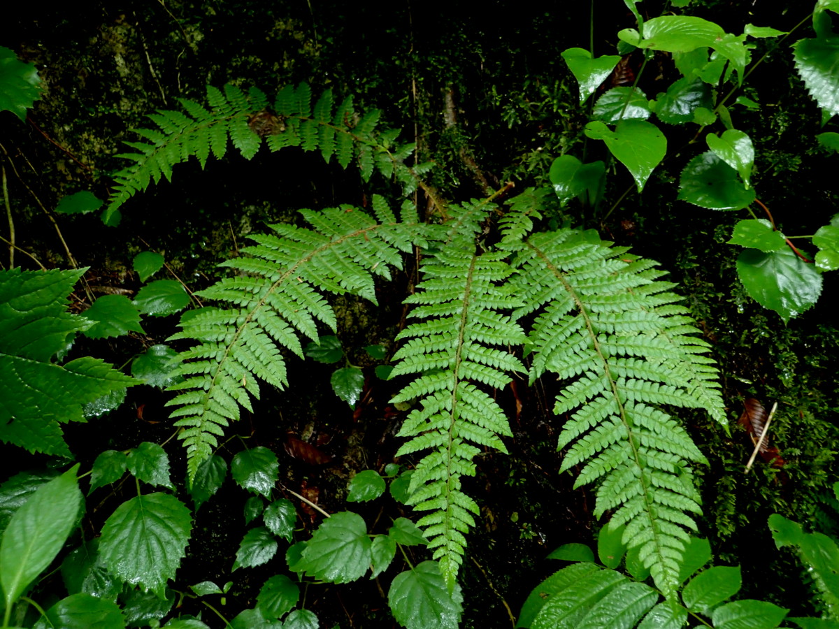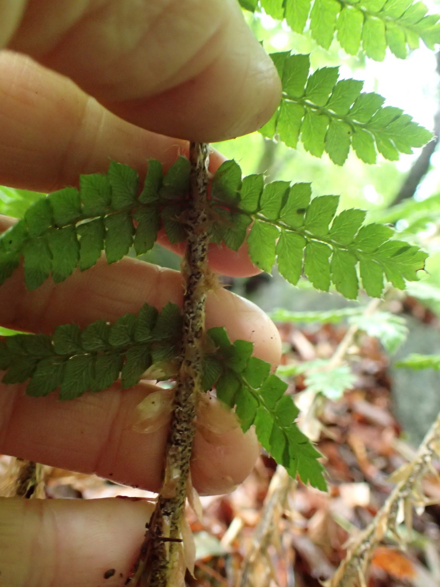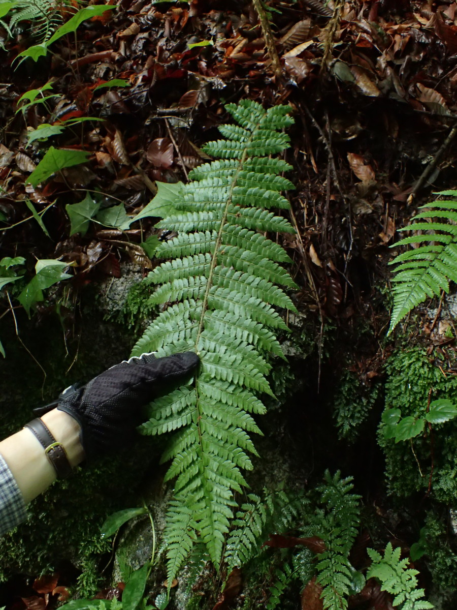 観察された特徴:夏緑性。葉柄は短く5~10cm。葉柄の鱗片は淡褐色・膜質、卵状披針形。葉身はネクタイ形。胞子嚢群は小羽片の中肋寄りにつき、標高が高いためこの季節胞子嚢は熟し始め黒褐色の胞子嚢が混じり始めていた。