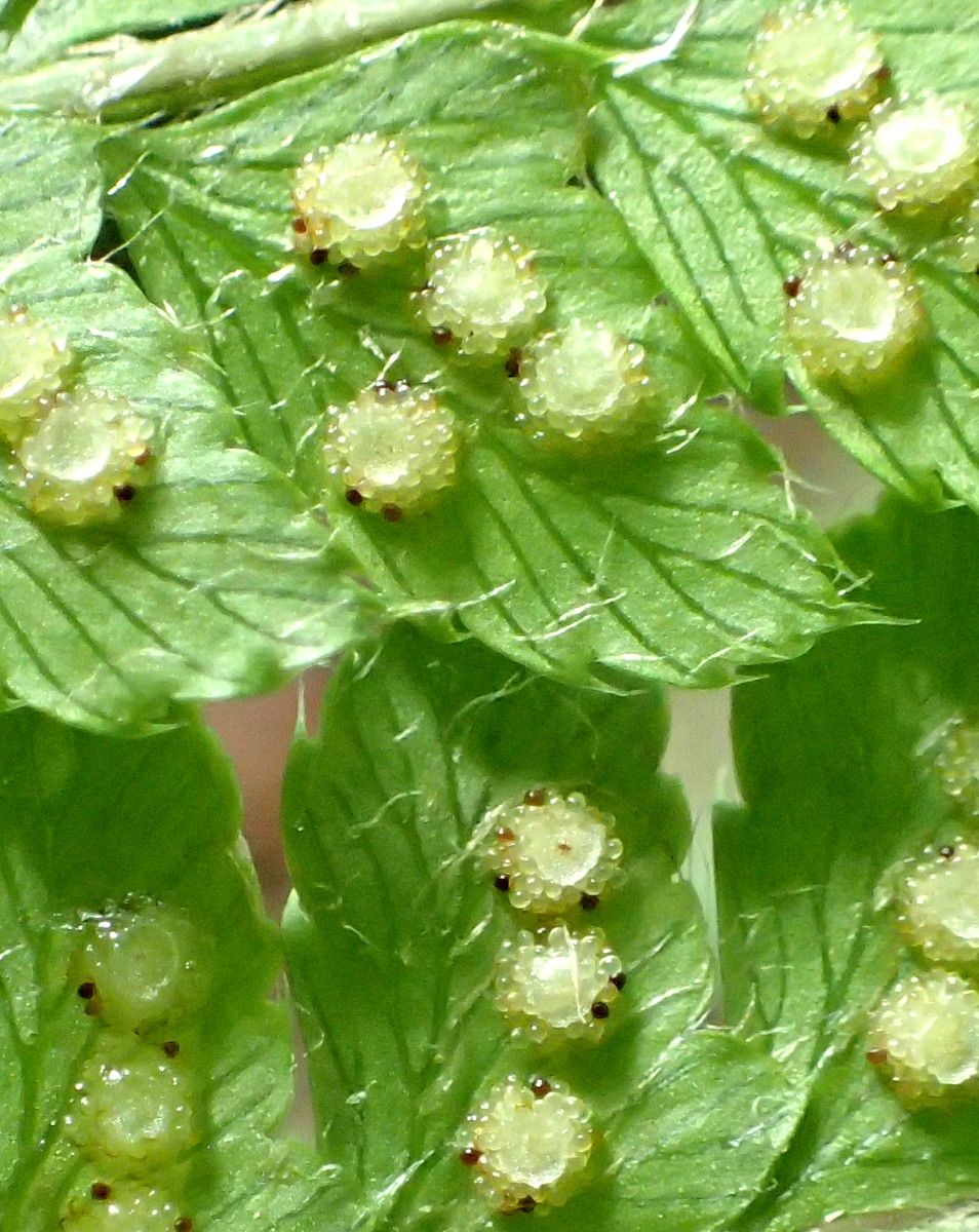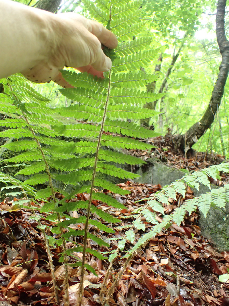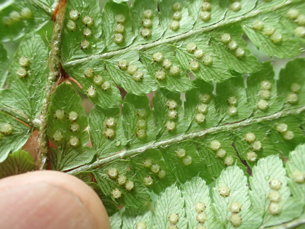 観察された特徴:夏緑性。葉柄は短く5~10cm。葉柄の鱗片は淡褐色・膜質、卵状披針形。葉身はネクタイ形。胞子嚢群は小羽片の中肋寄りにつき、標高が高いためこの季節胞子嚢は熟し始め黒褐色の胞子嚢が混じり始めていた。