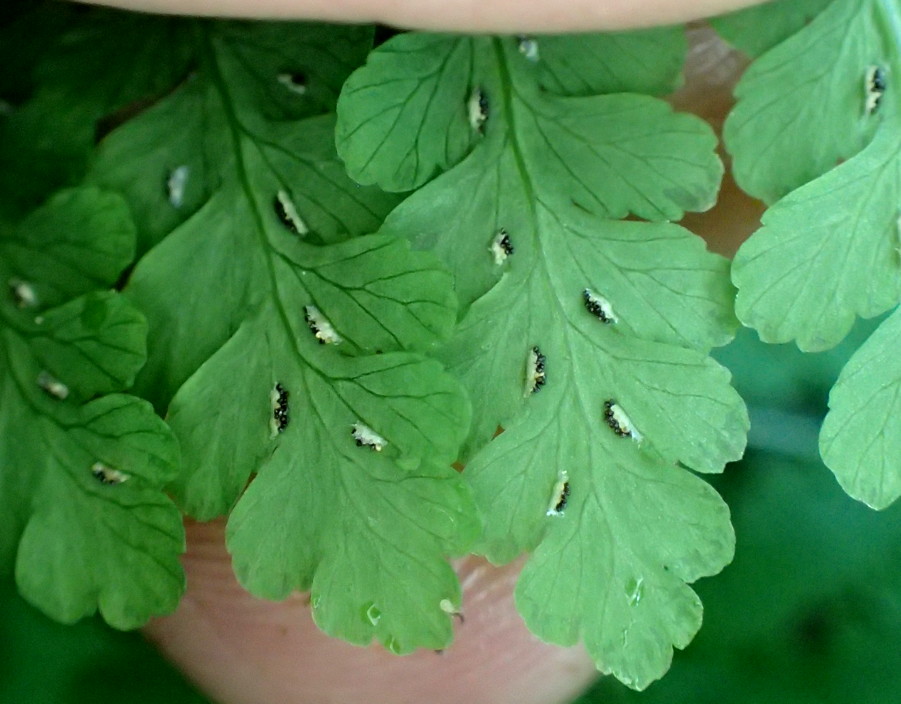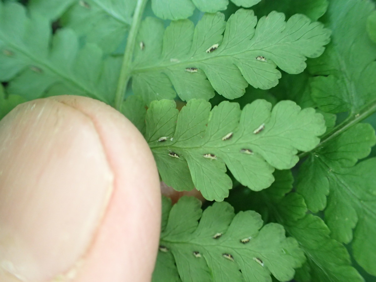 観察された特徴:夏緑性。根茎は細長く這い葉は順次つける。葉柄には濃褐色・披針形・やや光沢のある鱗片をつける。葉の大きさは35~45cm、卵形~卵状三角形、黄緑色~淡緑色。葉は3回羽状深裂~4回羽状浅裂。最下羽片はやや下向きにつき、最下羽片の羽軸は長い。胞子嚢群は線形~三日月形。