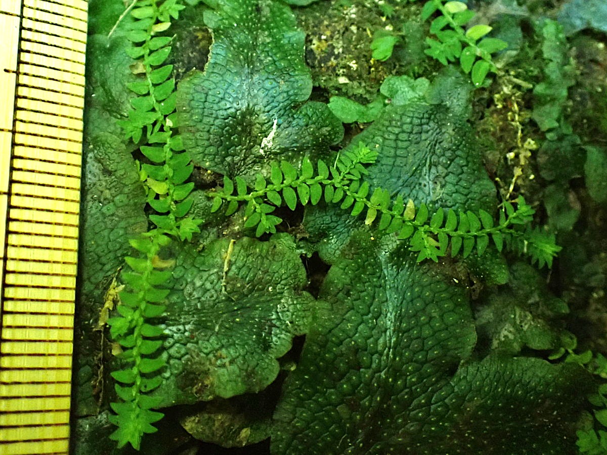 林内の日陰のウエットな岩壁に生育。葉は披針形。羽片は波打ち、葉身は立体的になる。胞子は歪な形のものがほとんどであった。