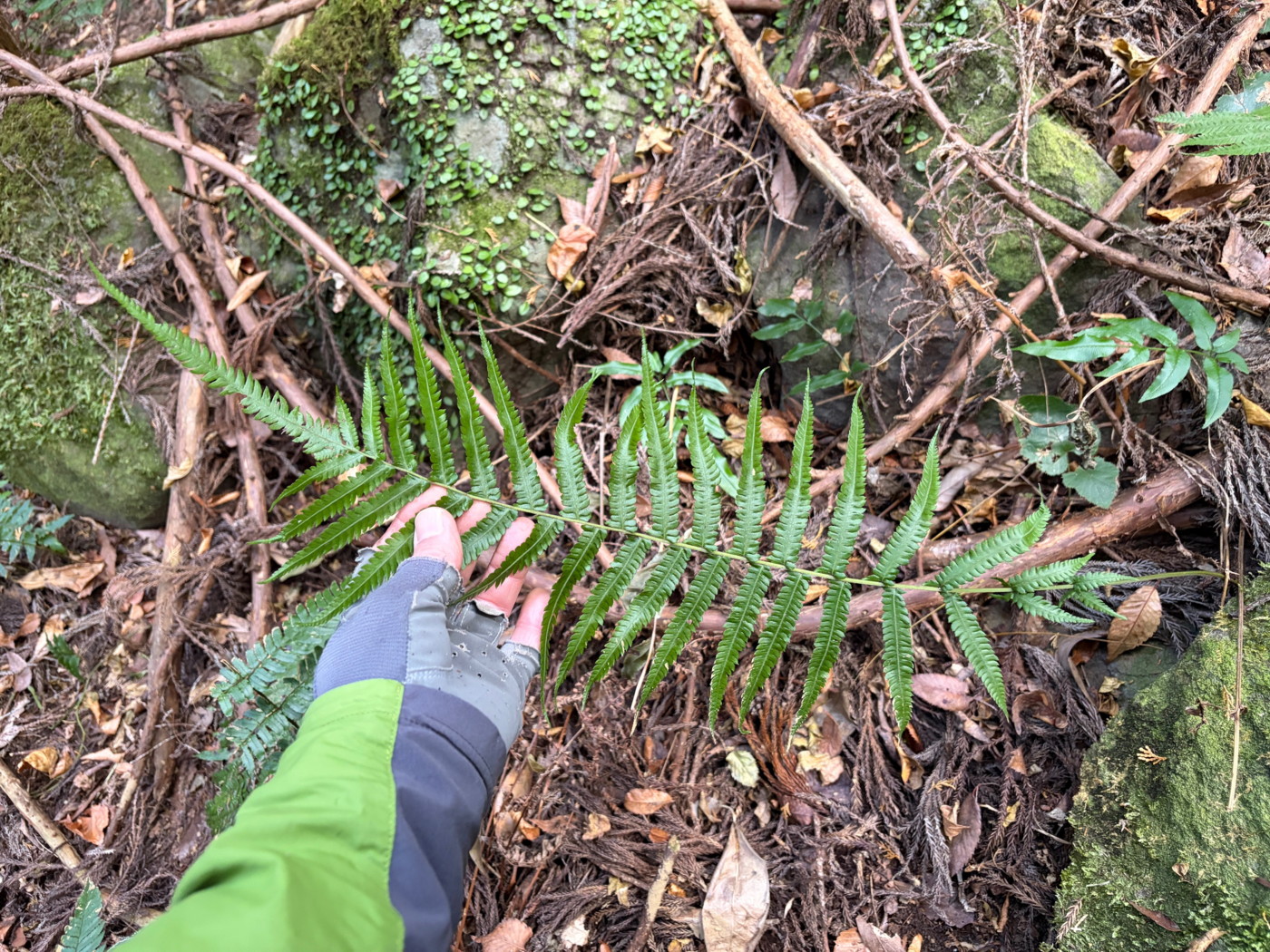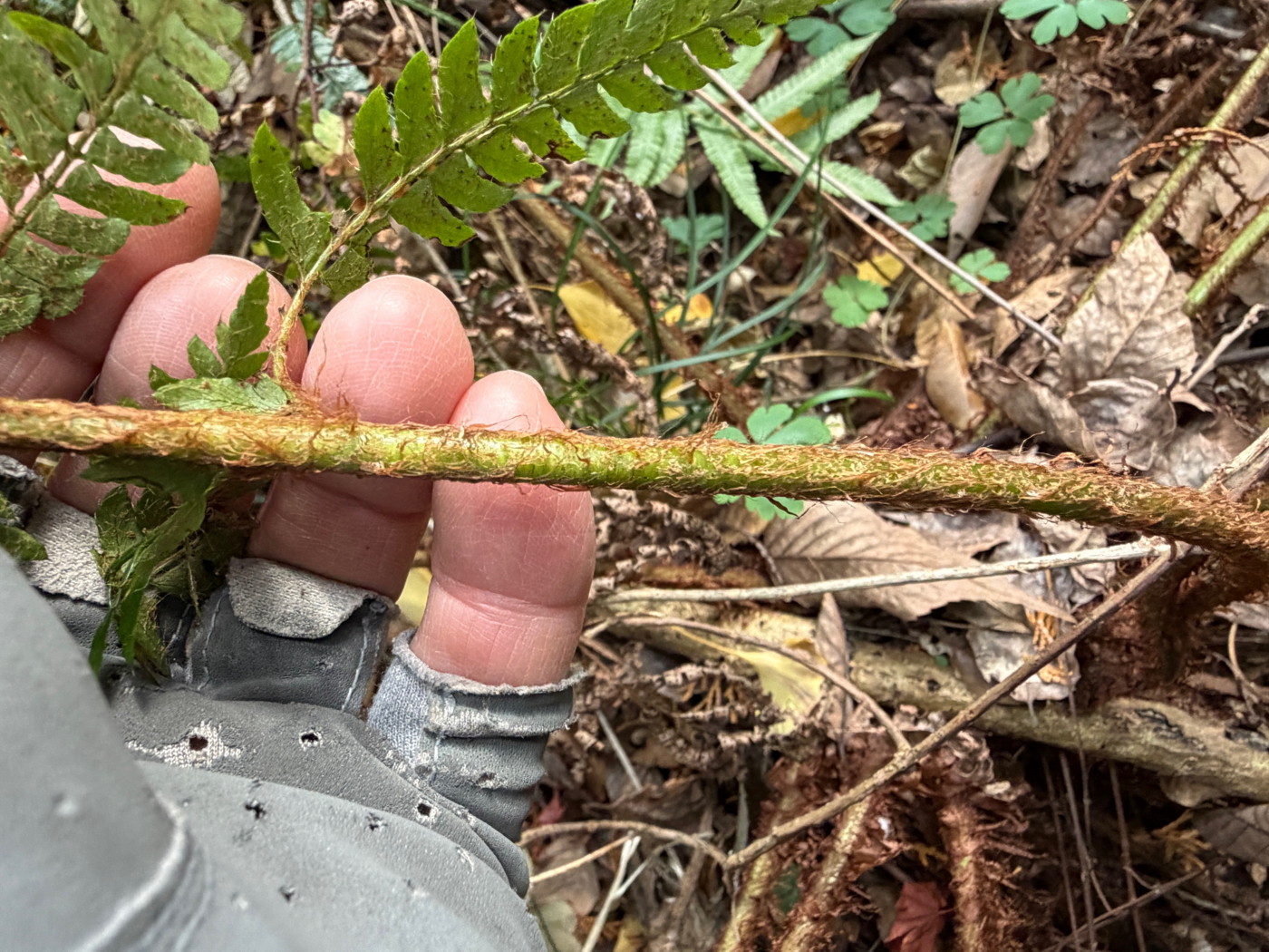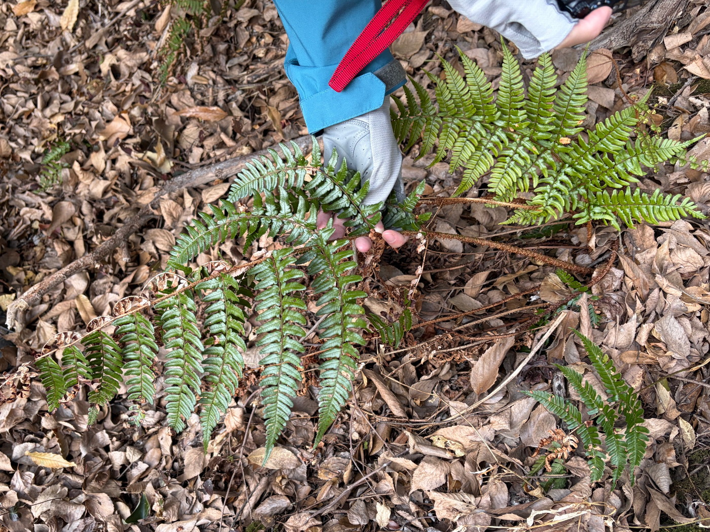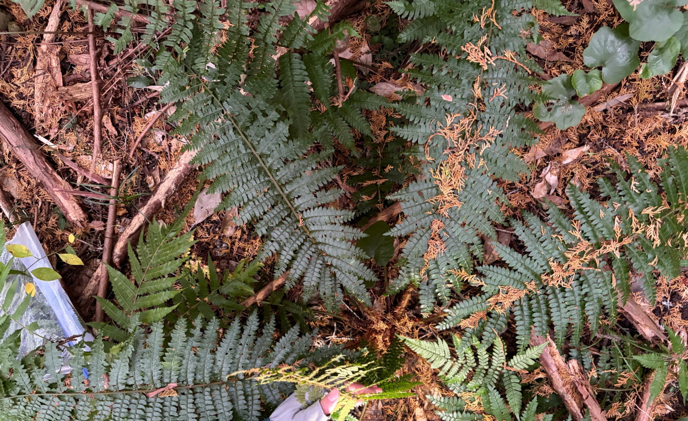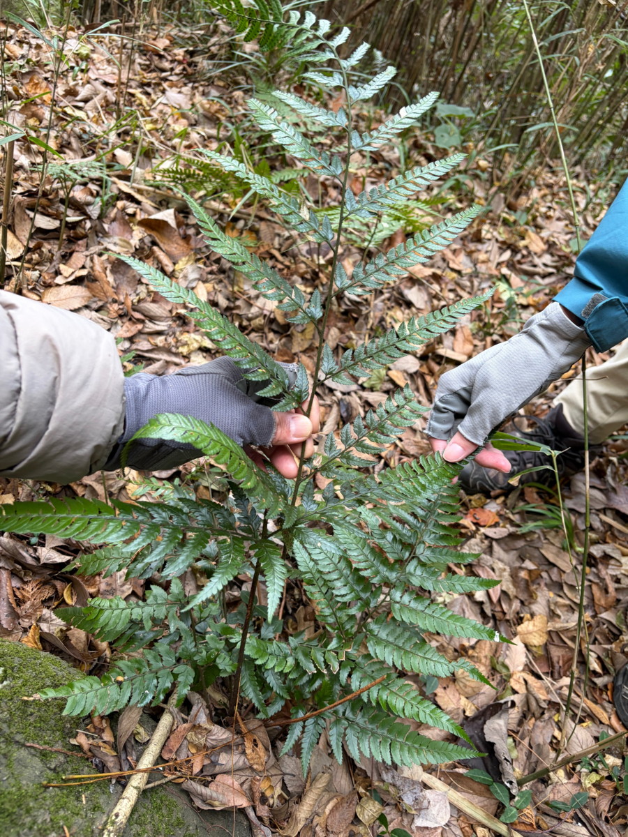 奈古谷の森では谷沿いに生えるシダの中で優占種。根茎の写真を撮影し埋め戻す。