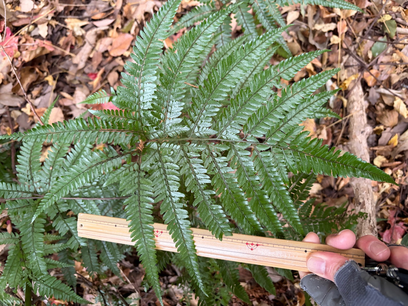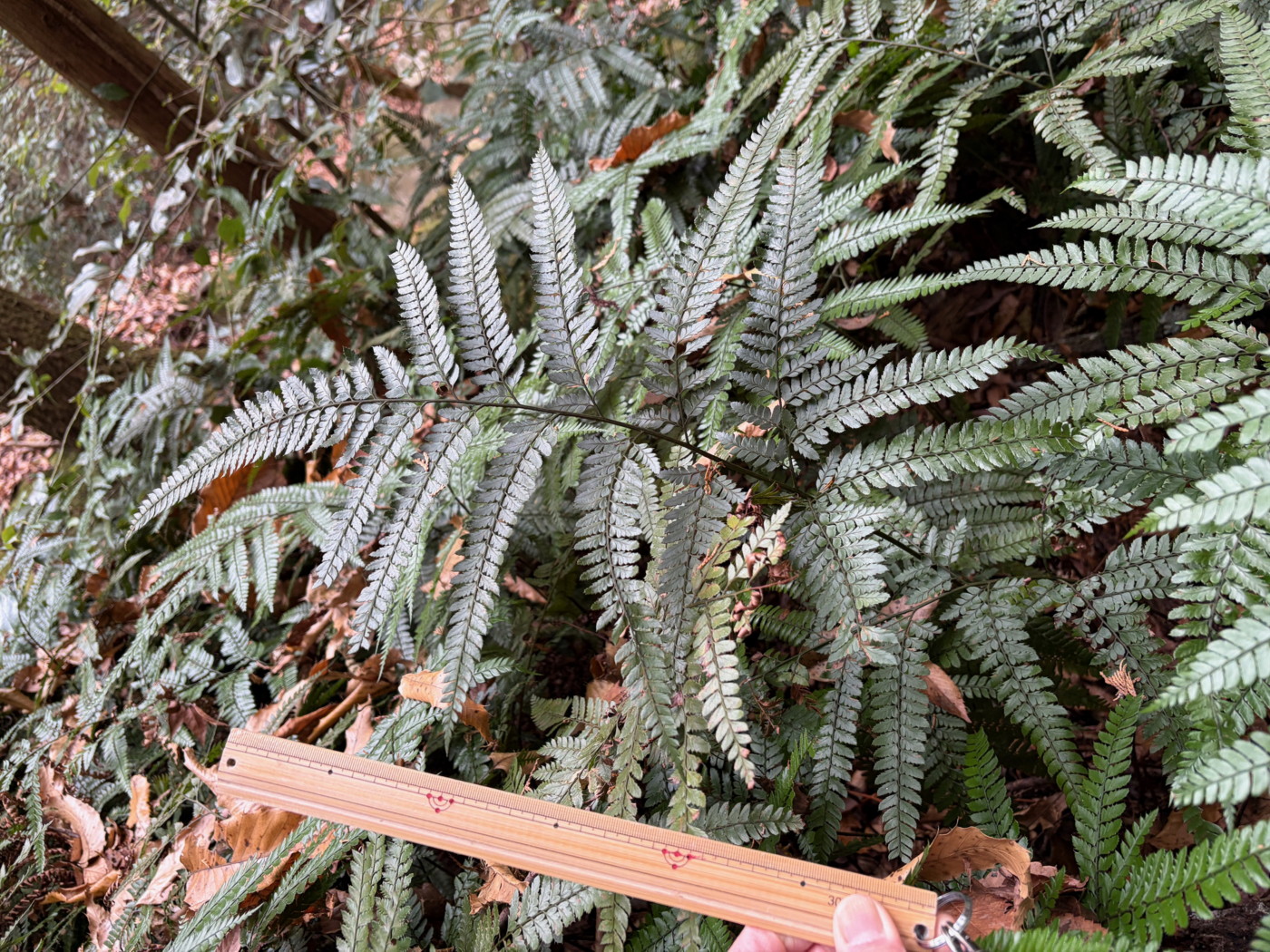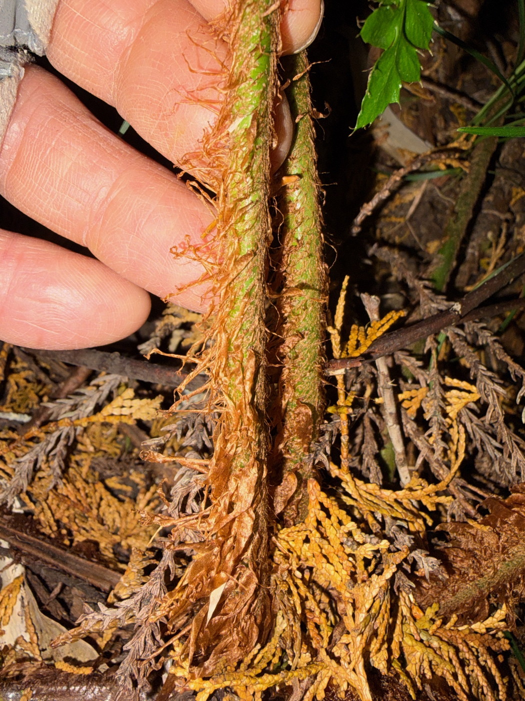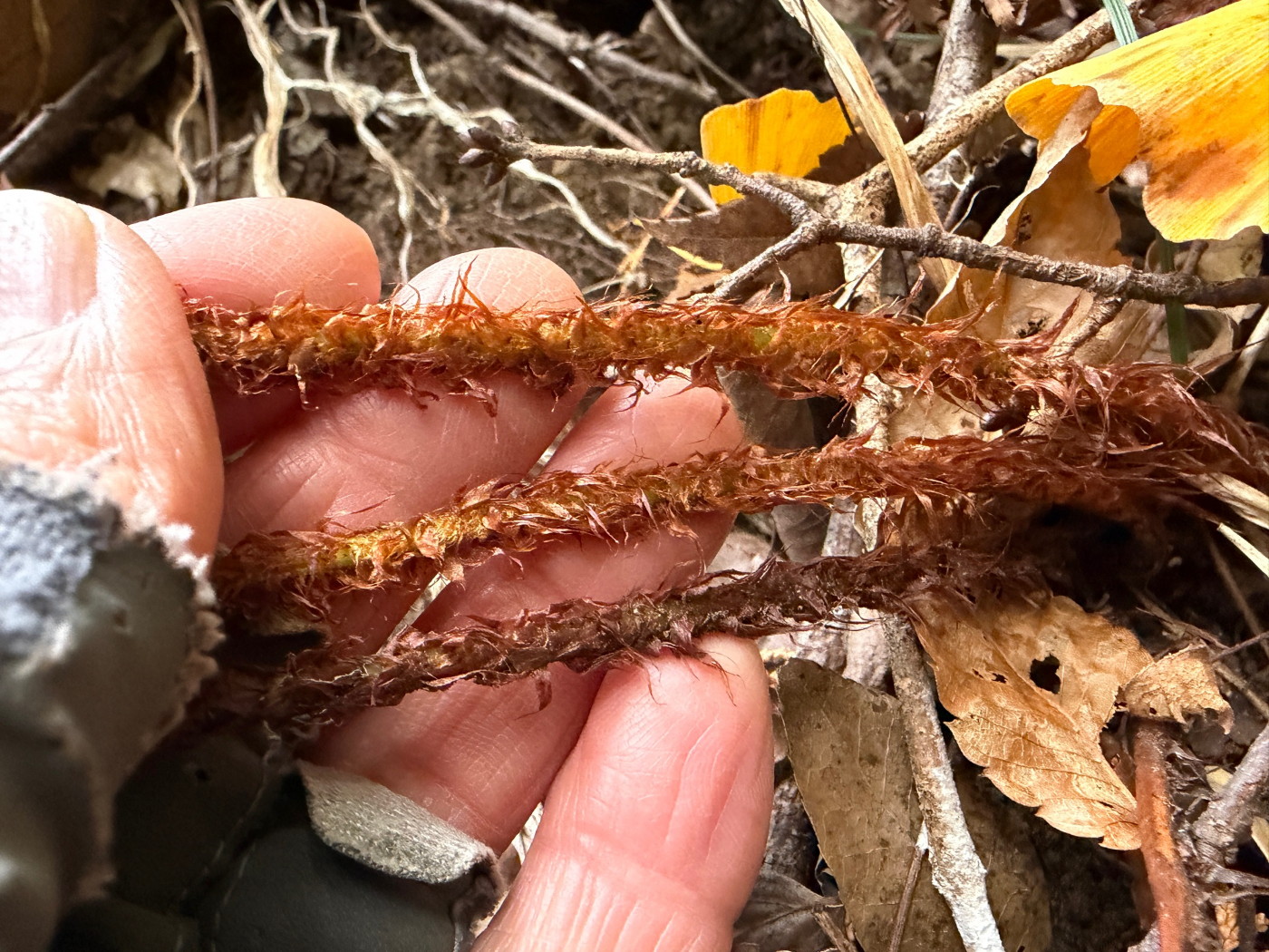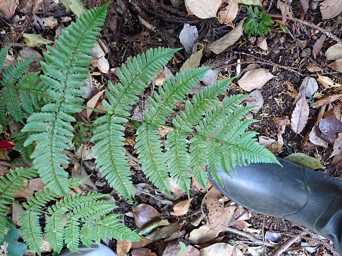 奈古谷の森では谷沿いに生えるシダの中で優占種。根茎の写真を撮影し埋め戻す。