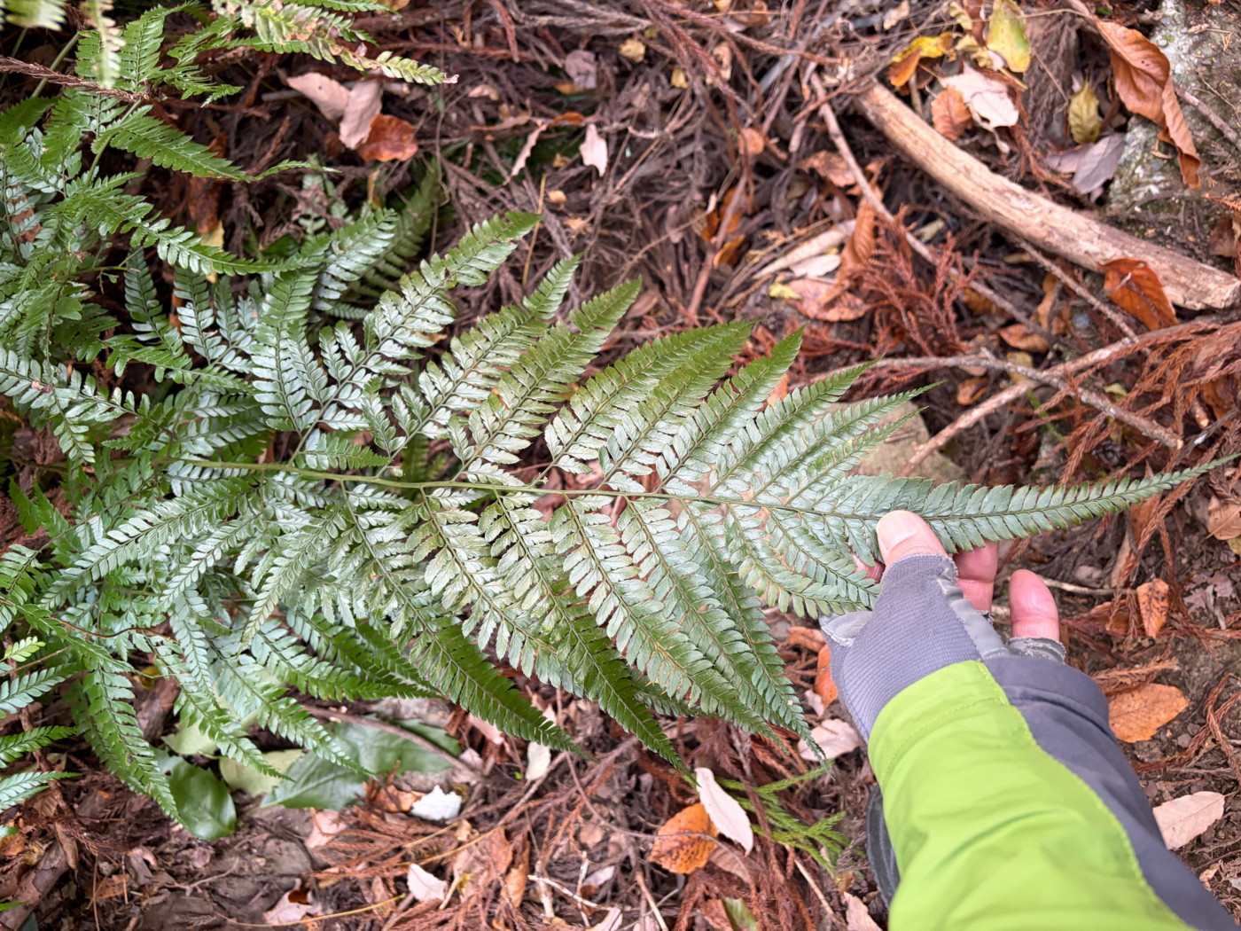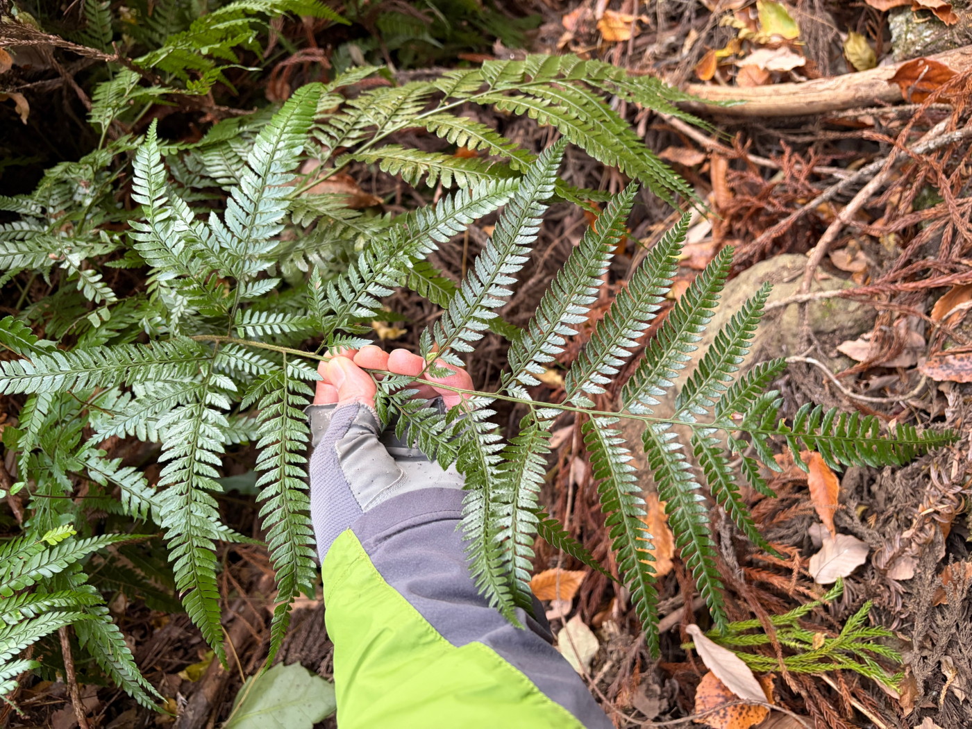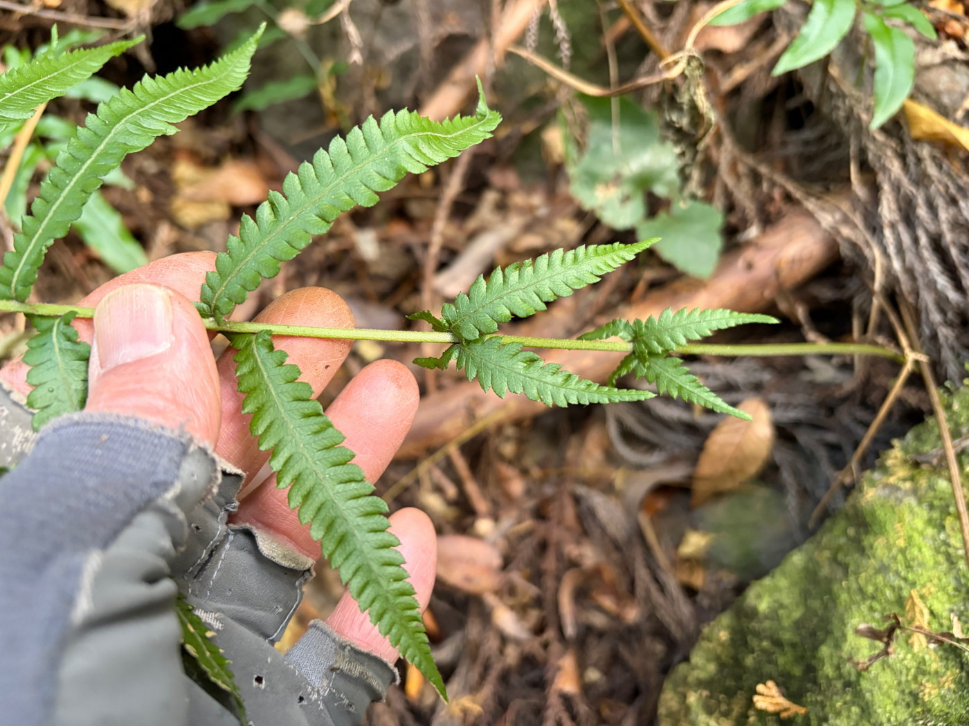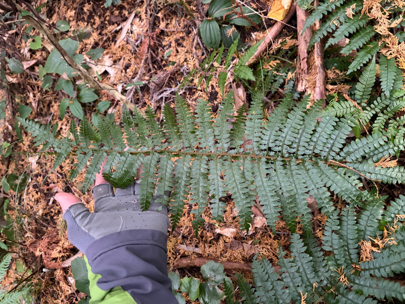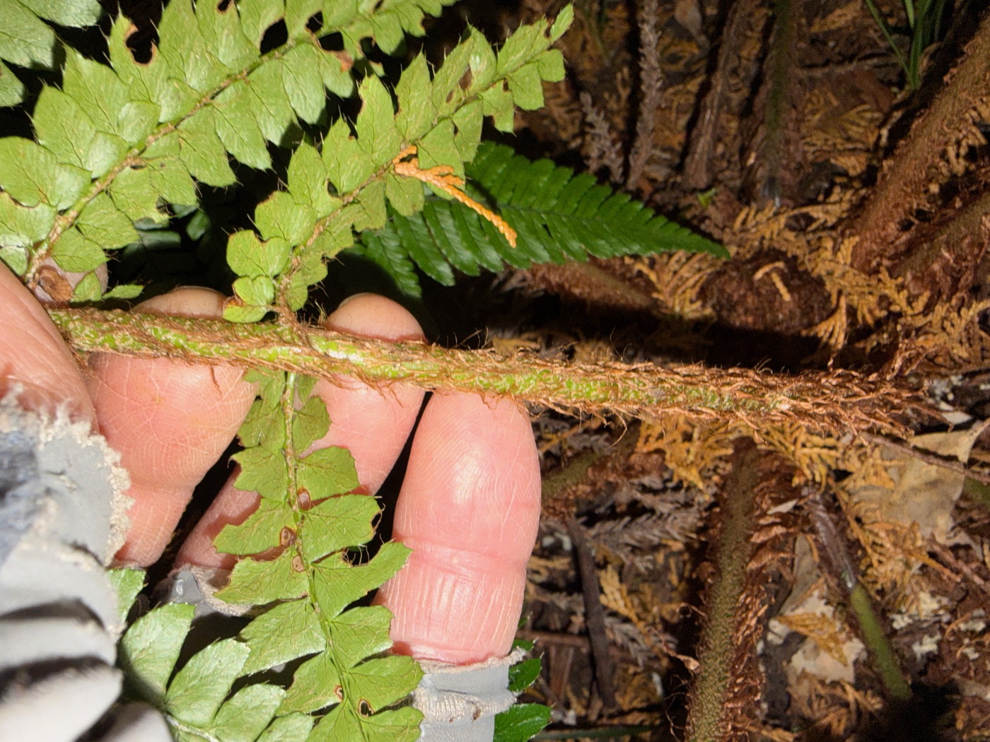 奈古谷の森では谷沿いに生えるシダの中で優占種。根茎の写真を撮影し埋め戻す。
