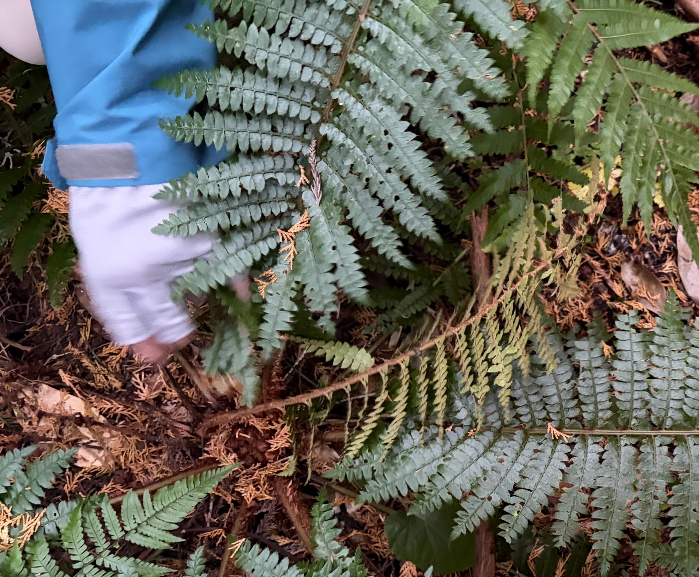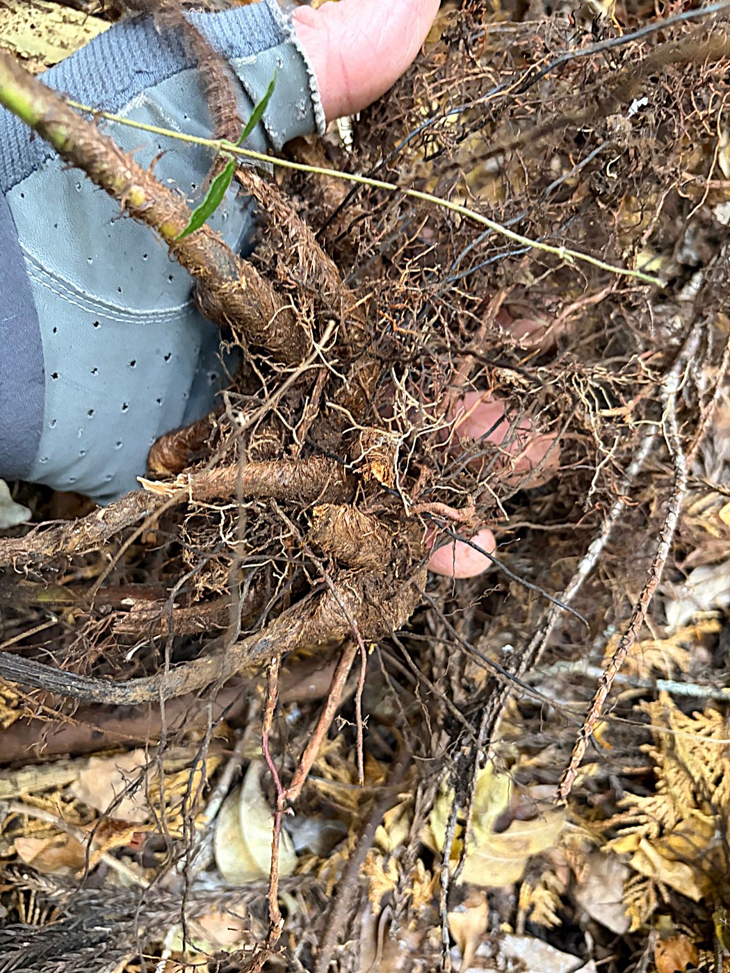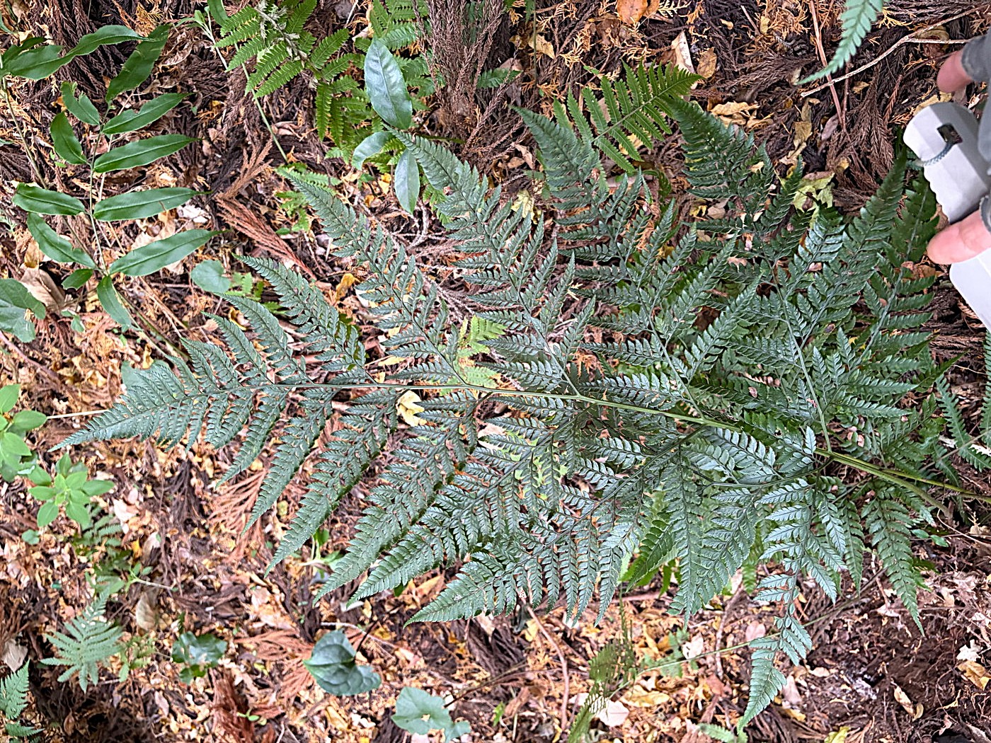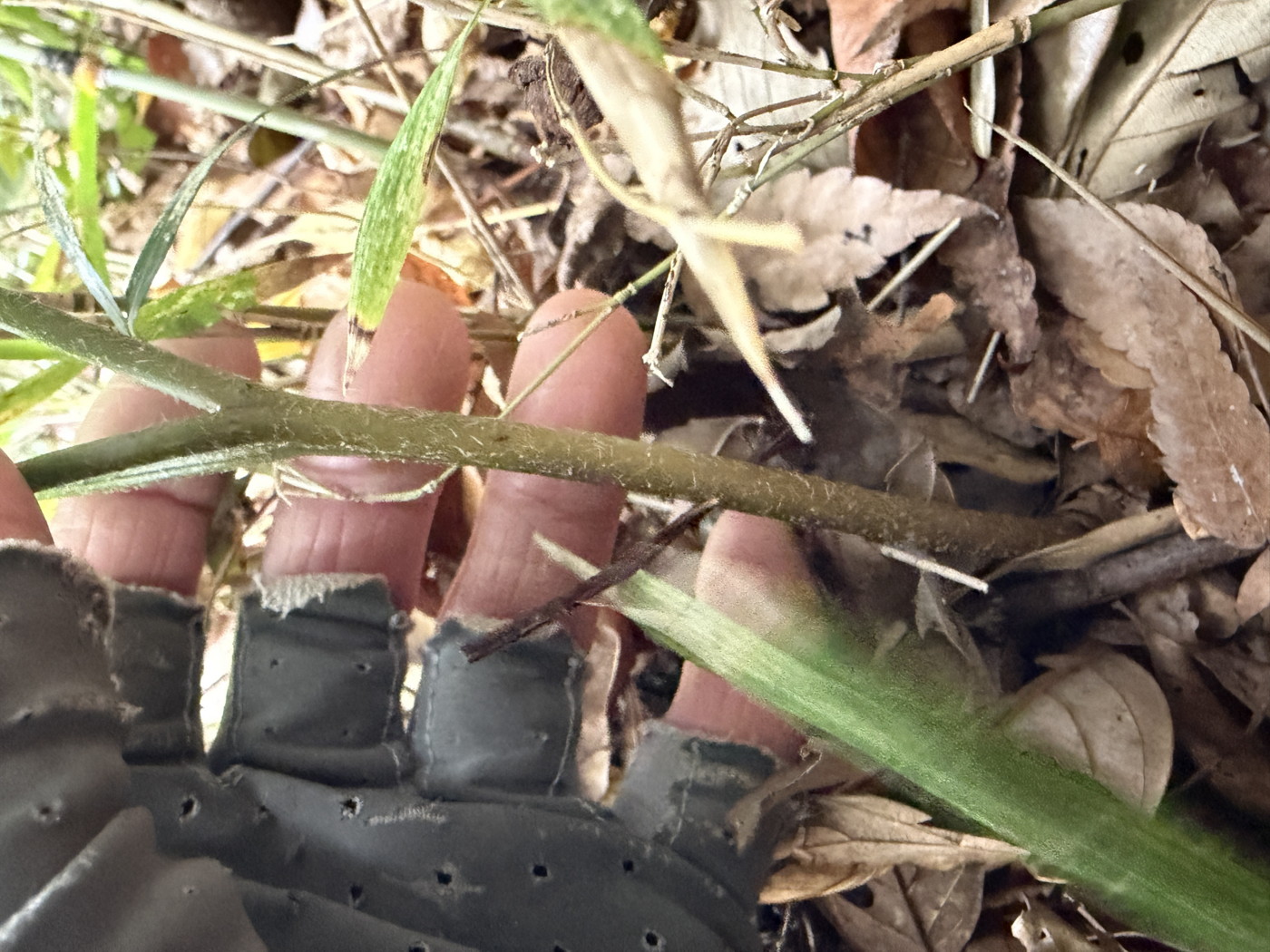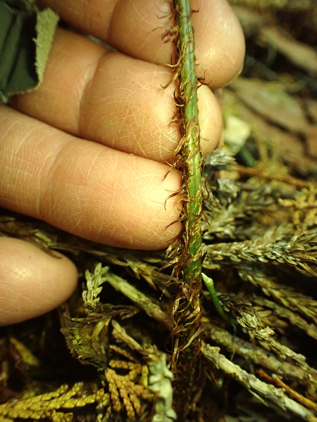 奈古谷の森では谷沿いに生えるシダの中で優占種。根茎の写真を撮影し埋め戻す。