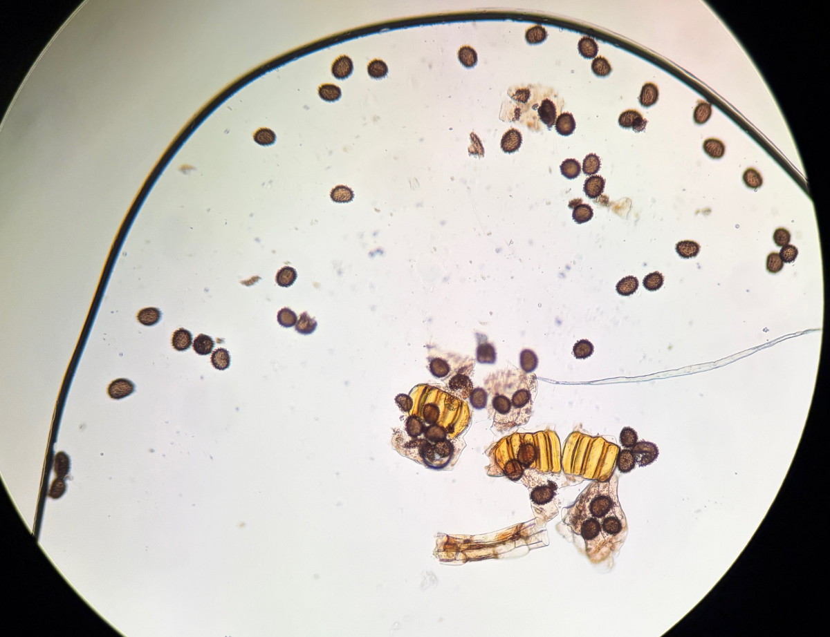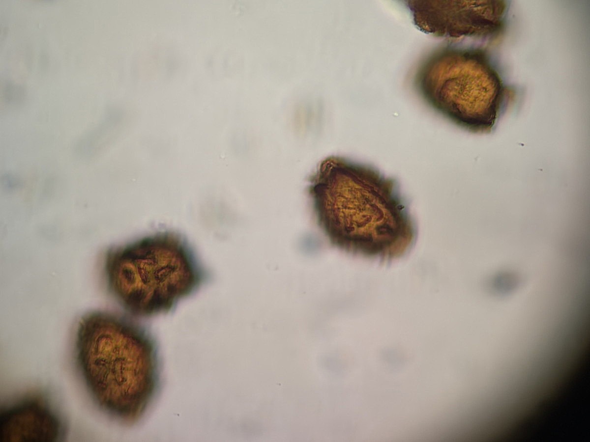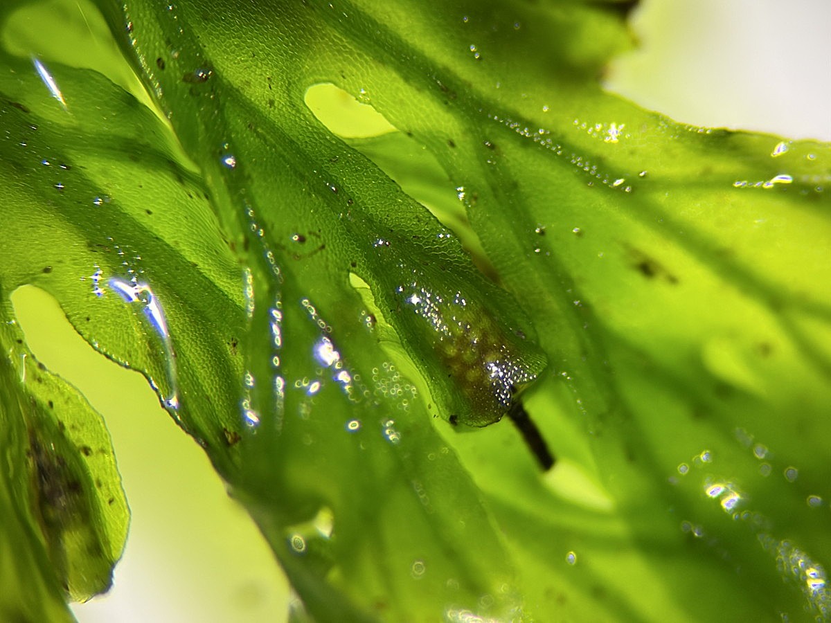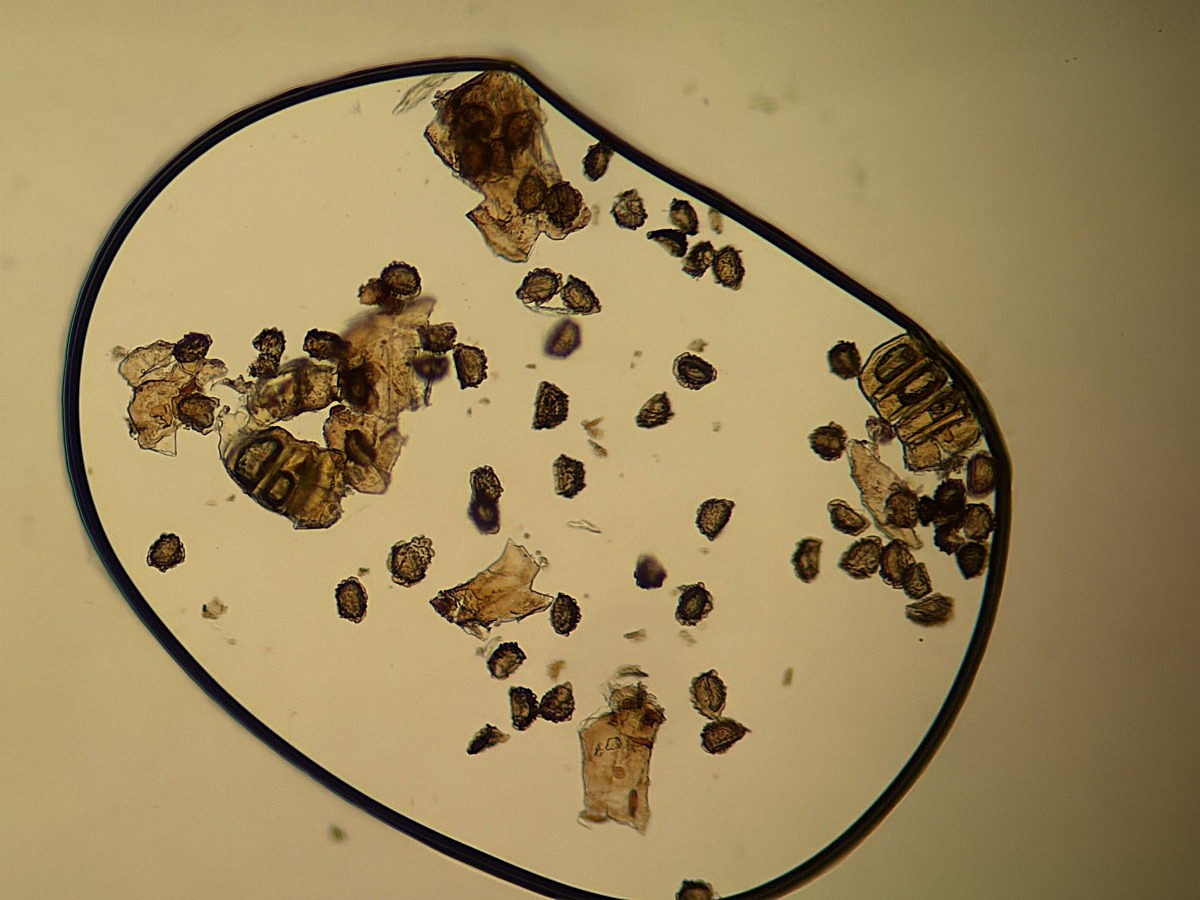 ①ホソコバカナワラビ、中身が詰まった胞子を壊したようす