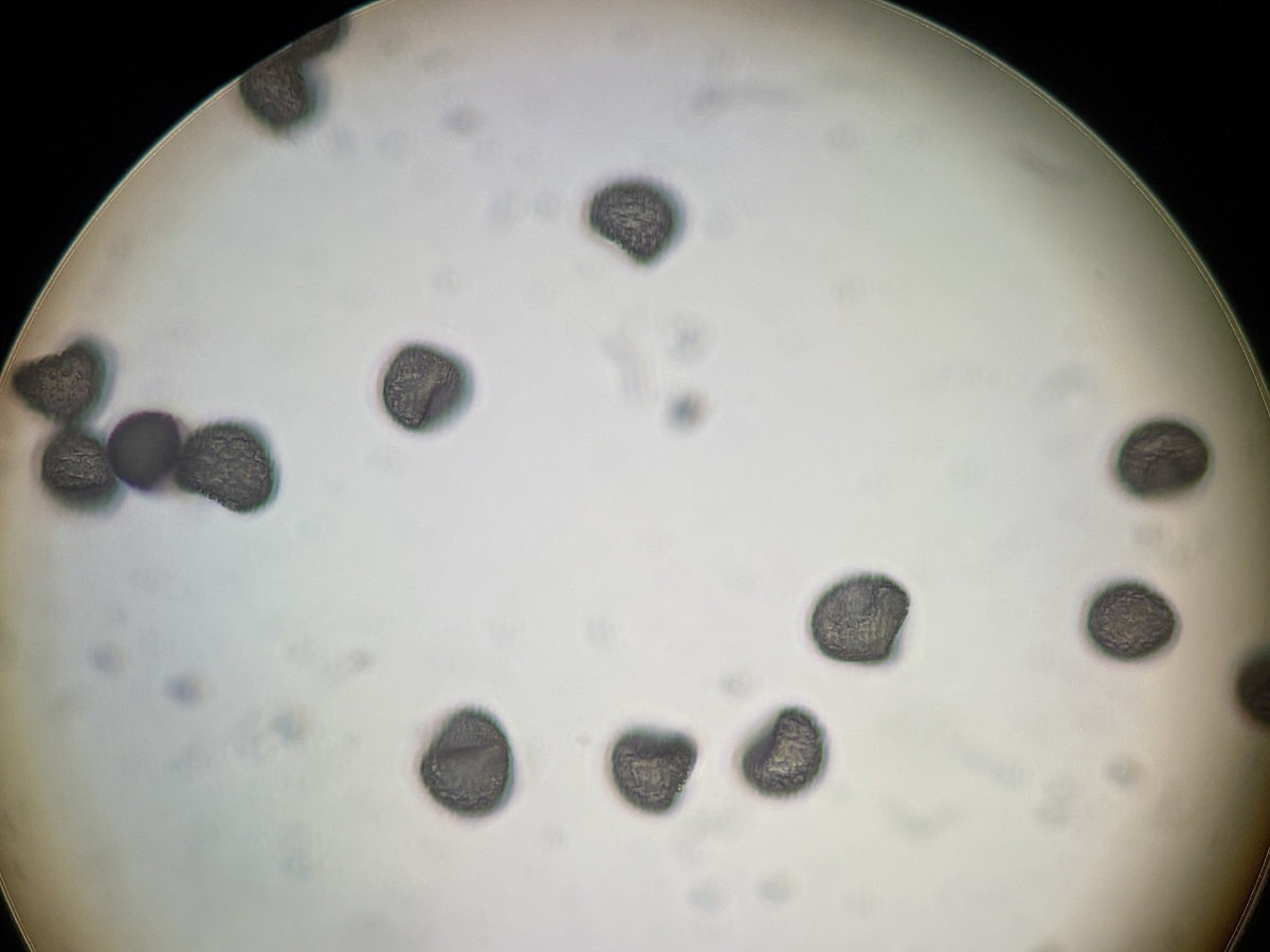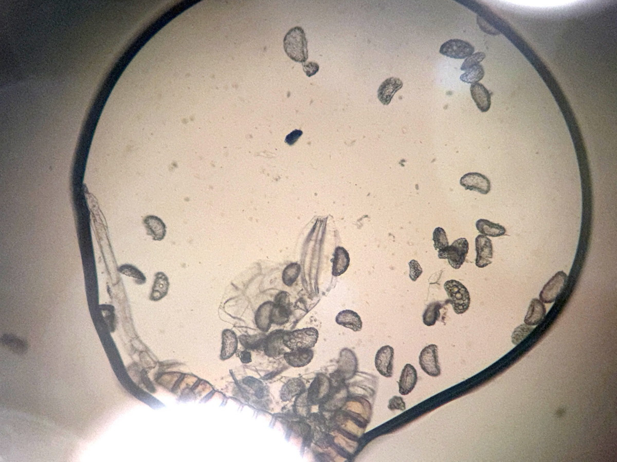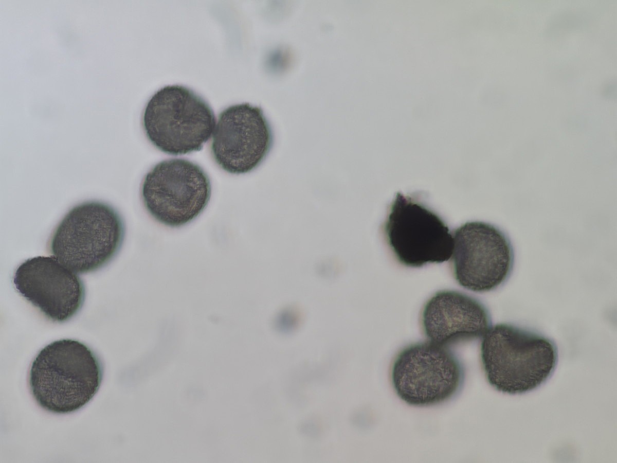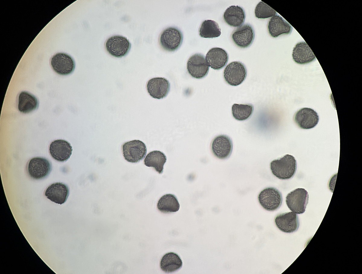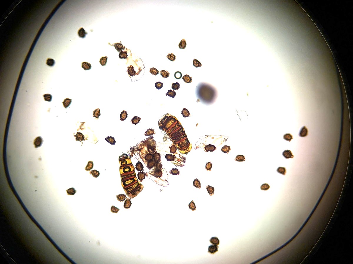 ①ホソコバカナワラビ、中身が詰まった胞子を壊したようす