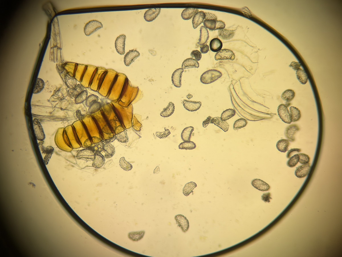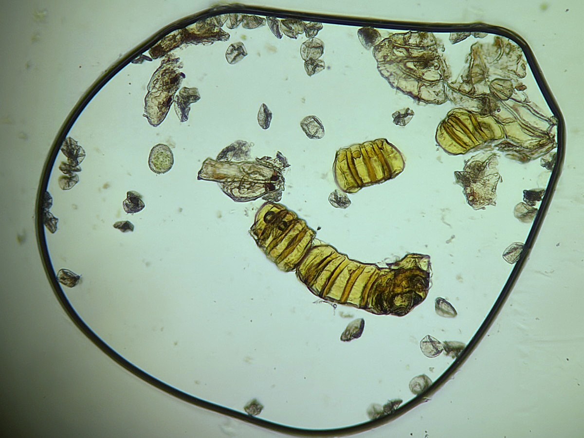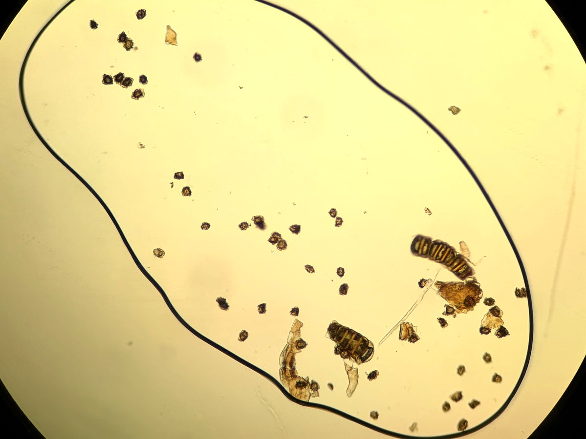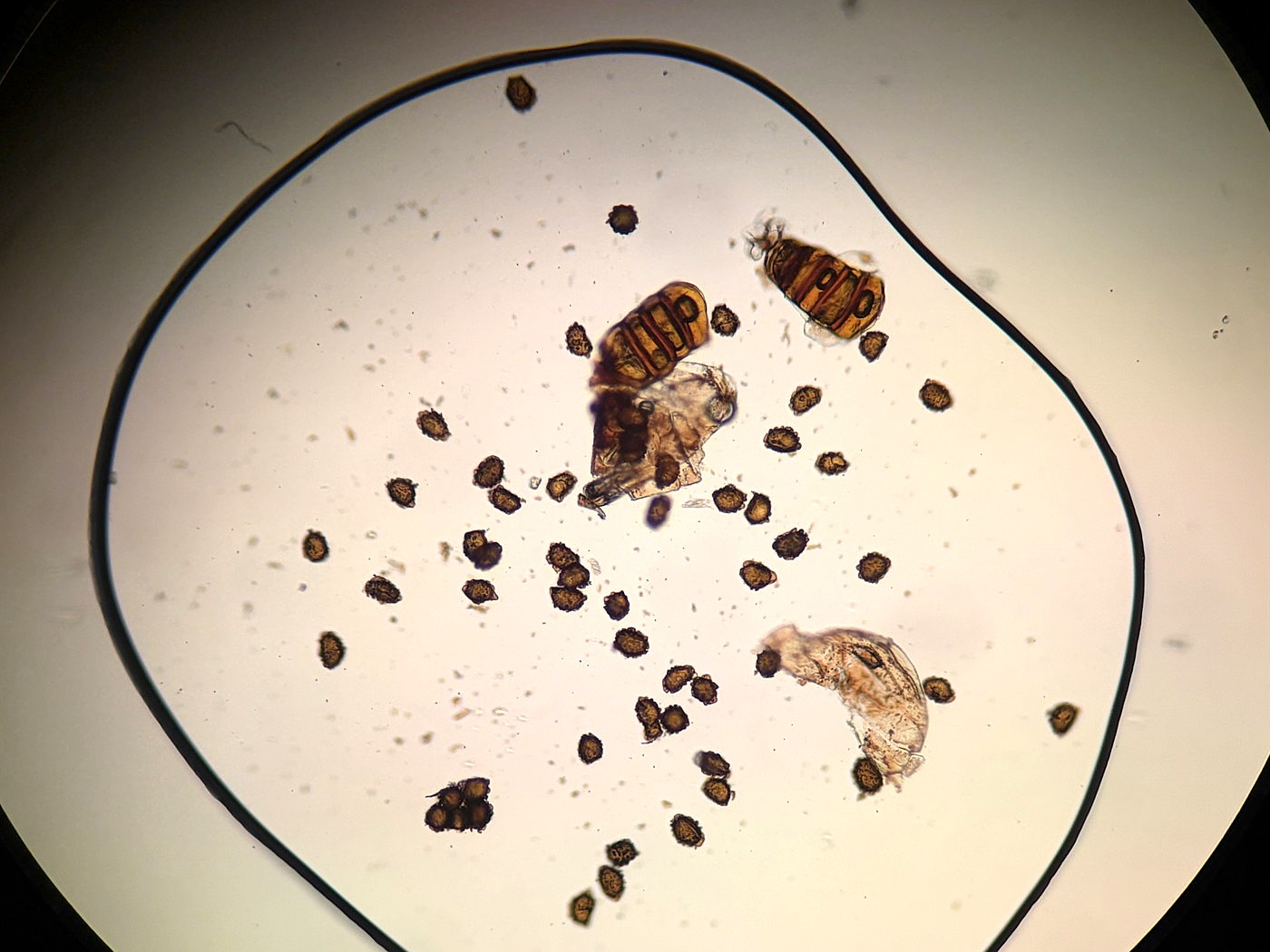 ①ホソコバカナワラビ、中身が詰まった胞子を壊したようす