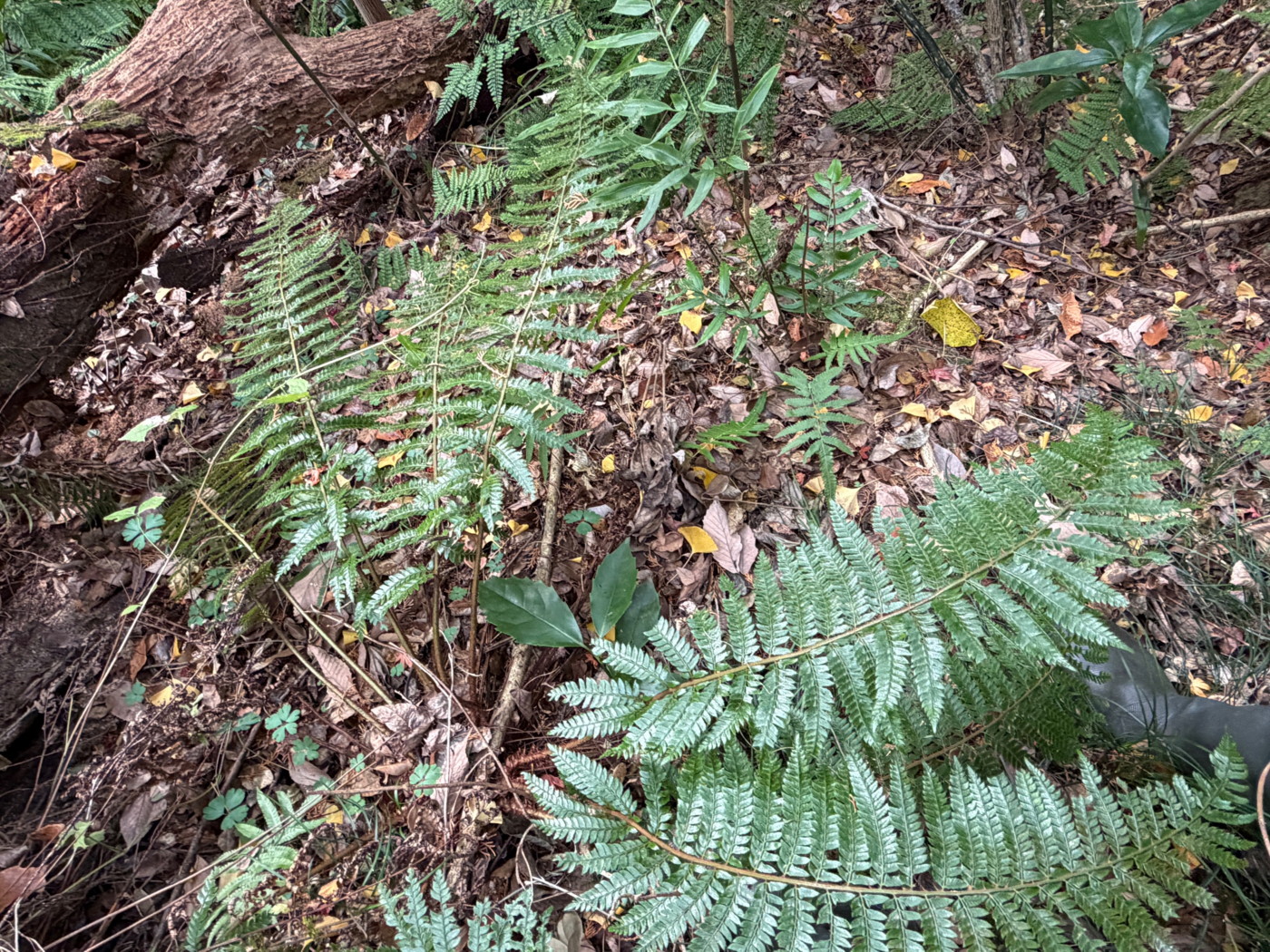 シカの食害が少ないためか、多様なシダが繁茂しシカ食害が激しいところに比べナチシダは少なかった。