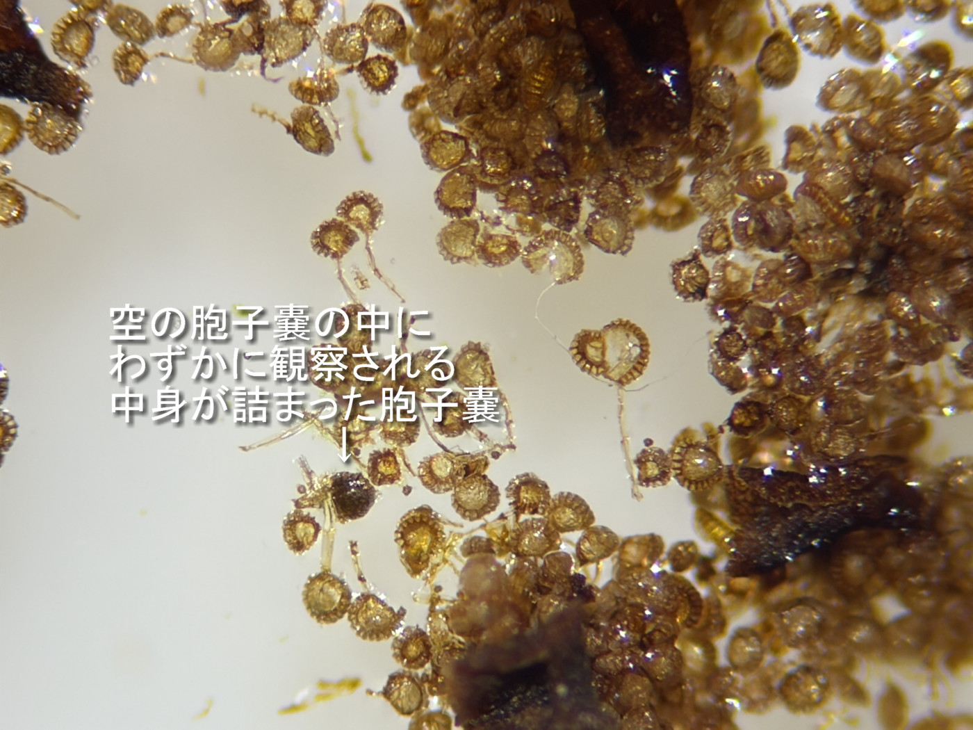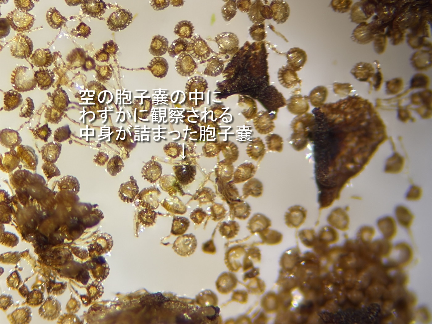 ①②コハイホラゴケ(ハイホラゴケ×ヒメハイホラゴケ)、1つの胞子のうを壊したようす