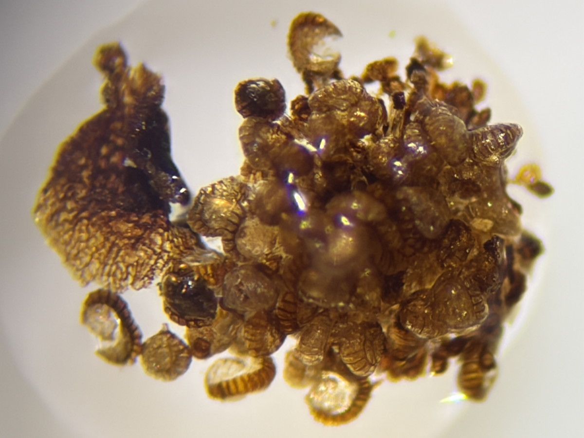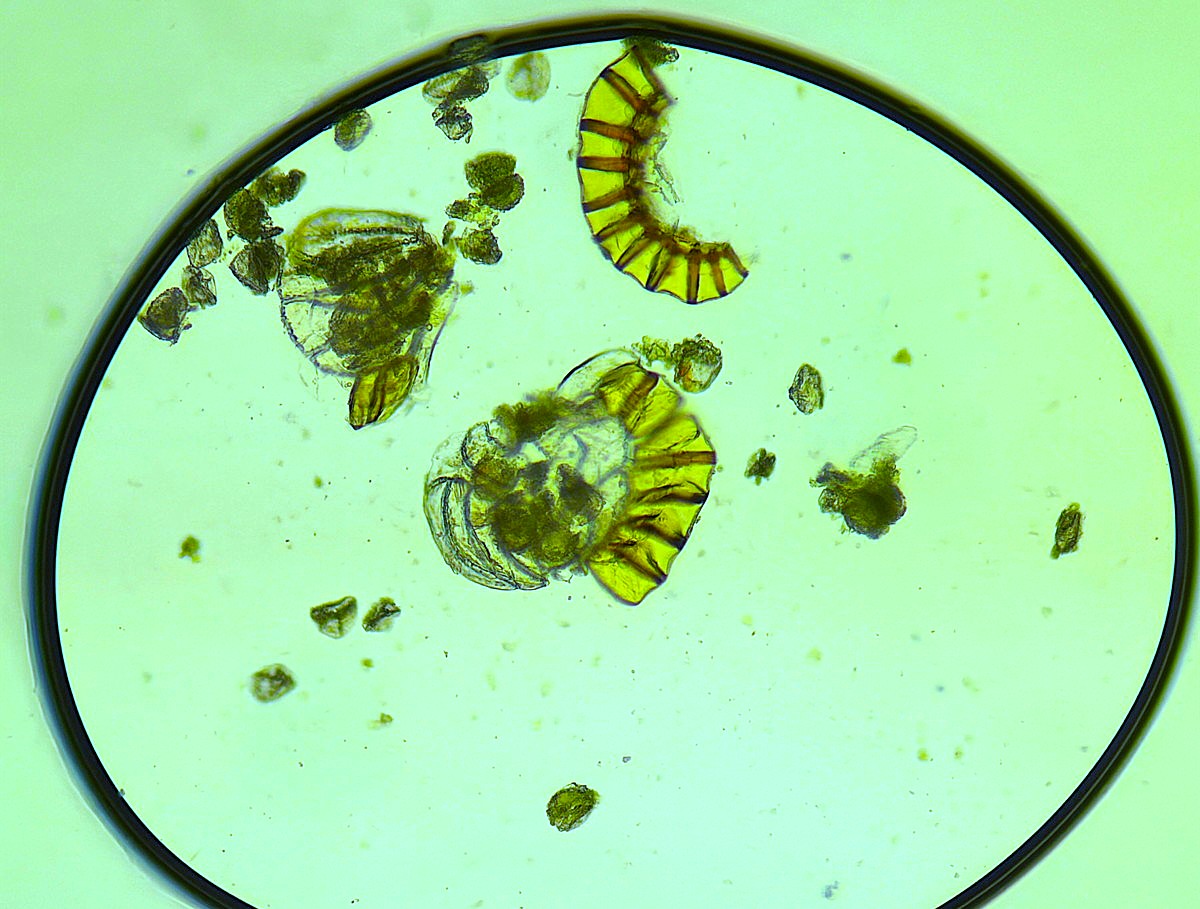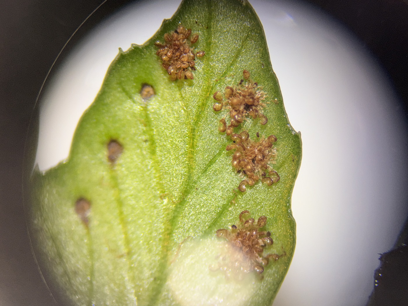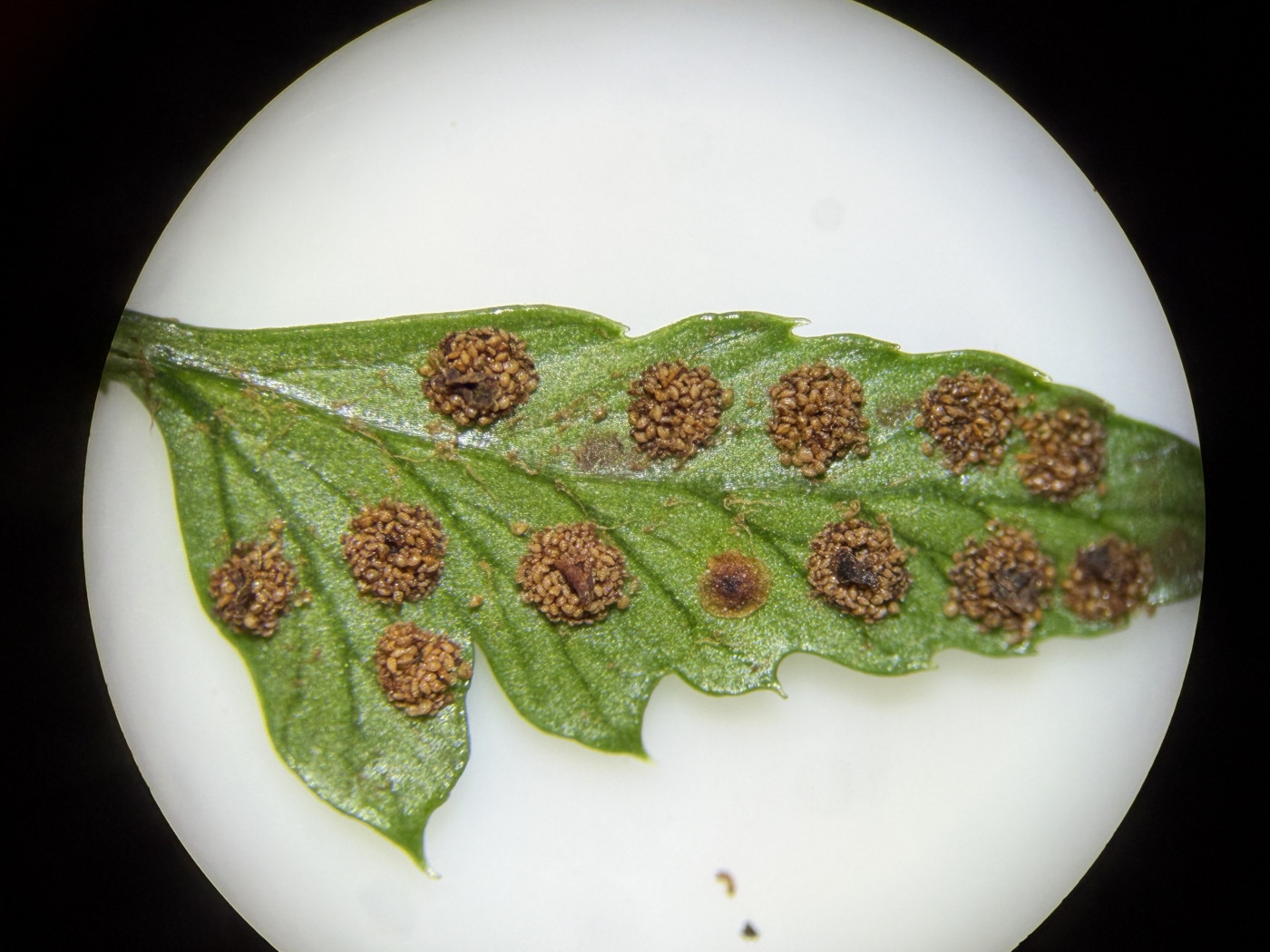 ①②ホソコバカナワラビ、ほとんど空の胞子嚢の中にわずかに観察される中身が詰まった胞子嚢
