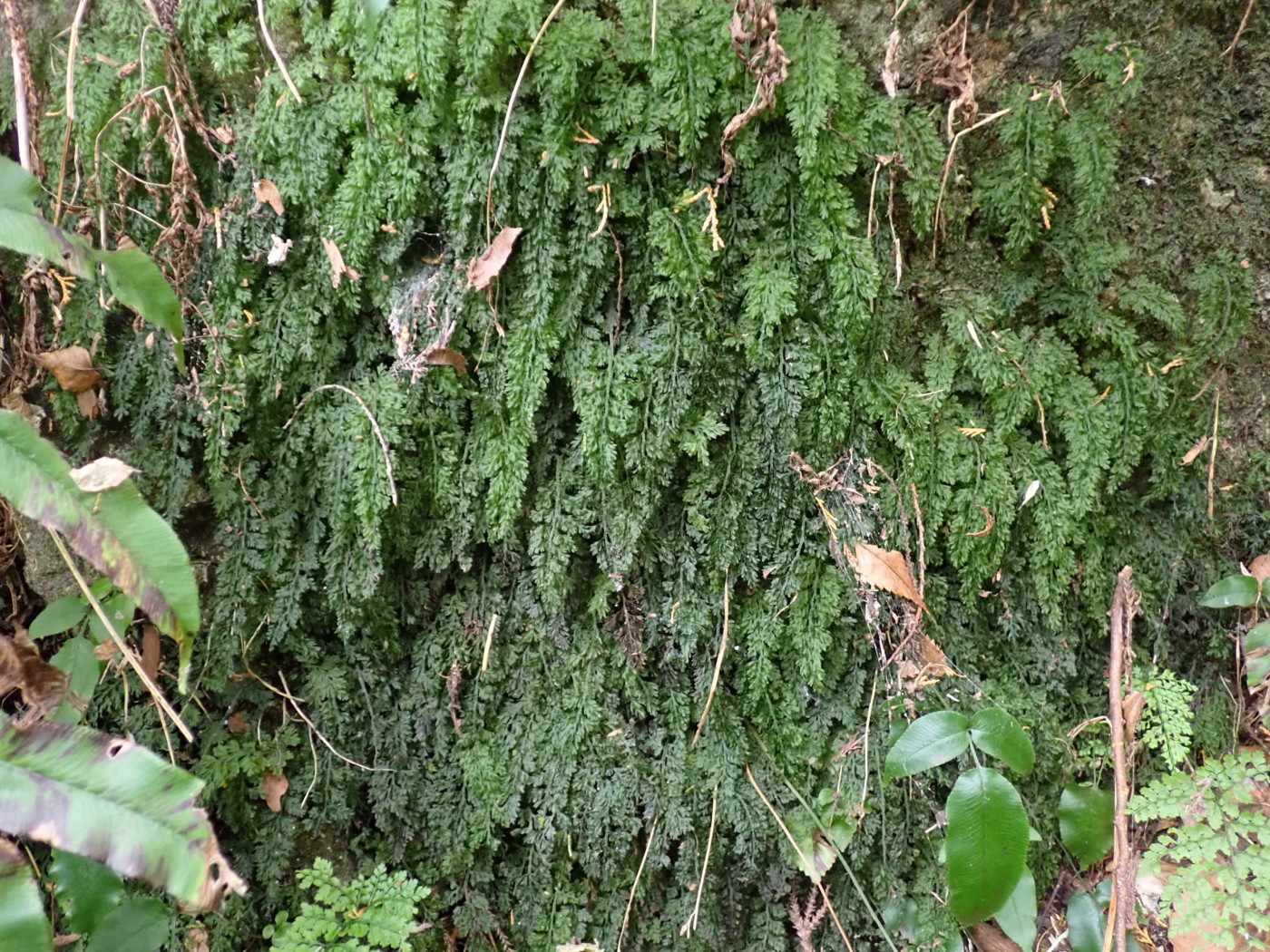 林内の日陰のウエットな岩壁に生育するコハイホラゴケ(ハイホラゴケ×ヒメハイホラゴケ)