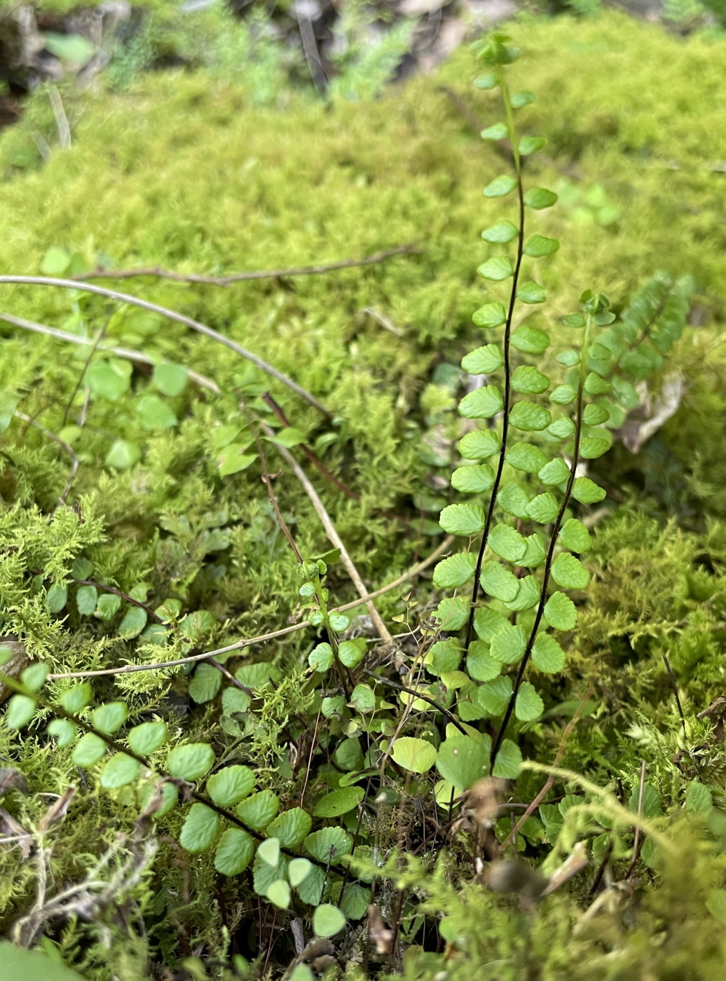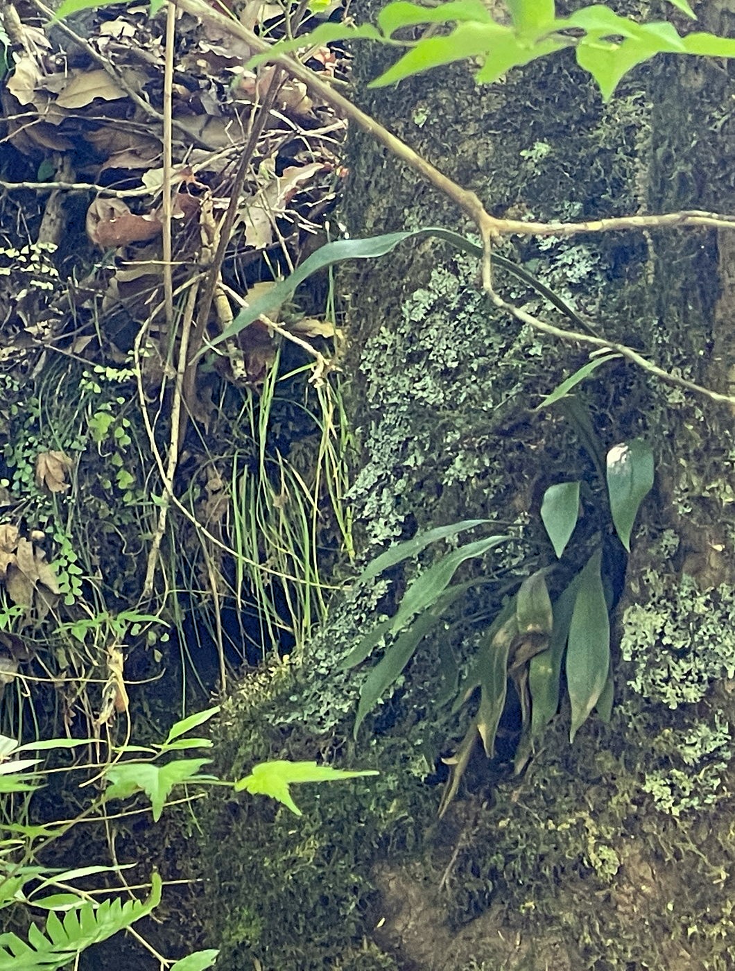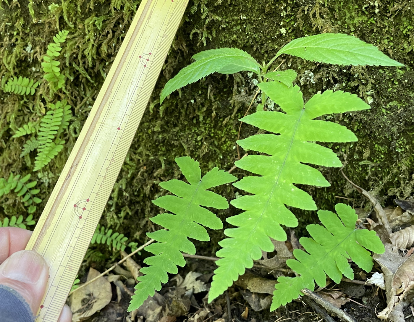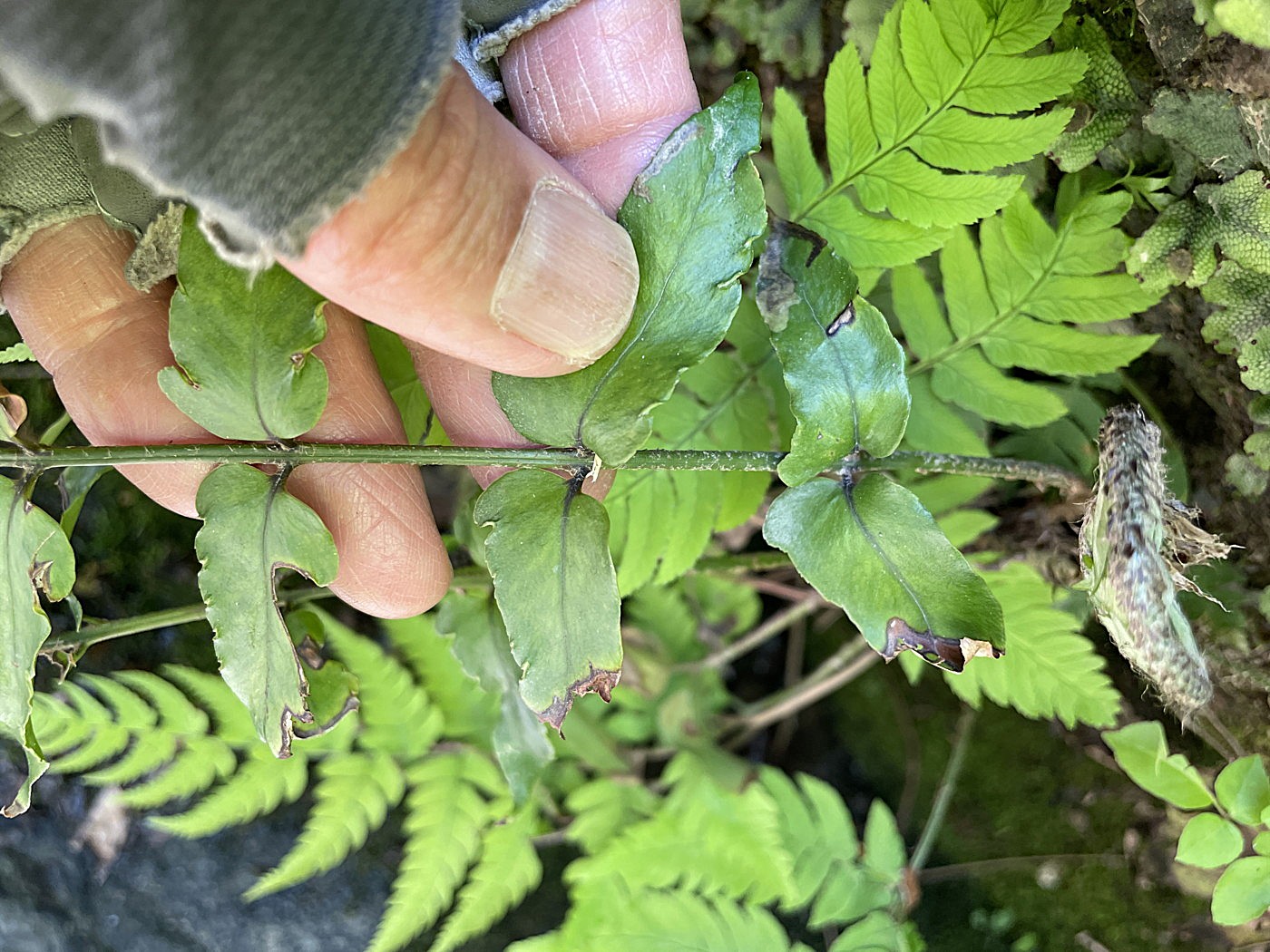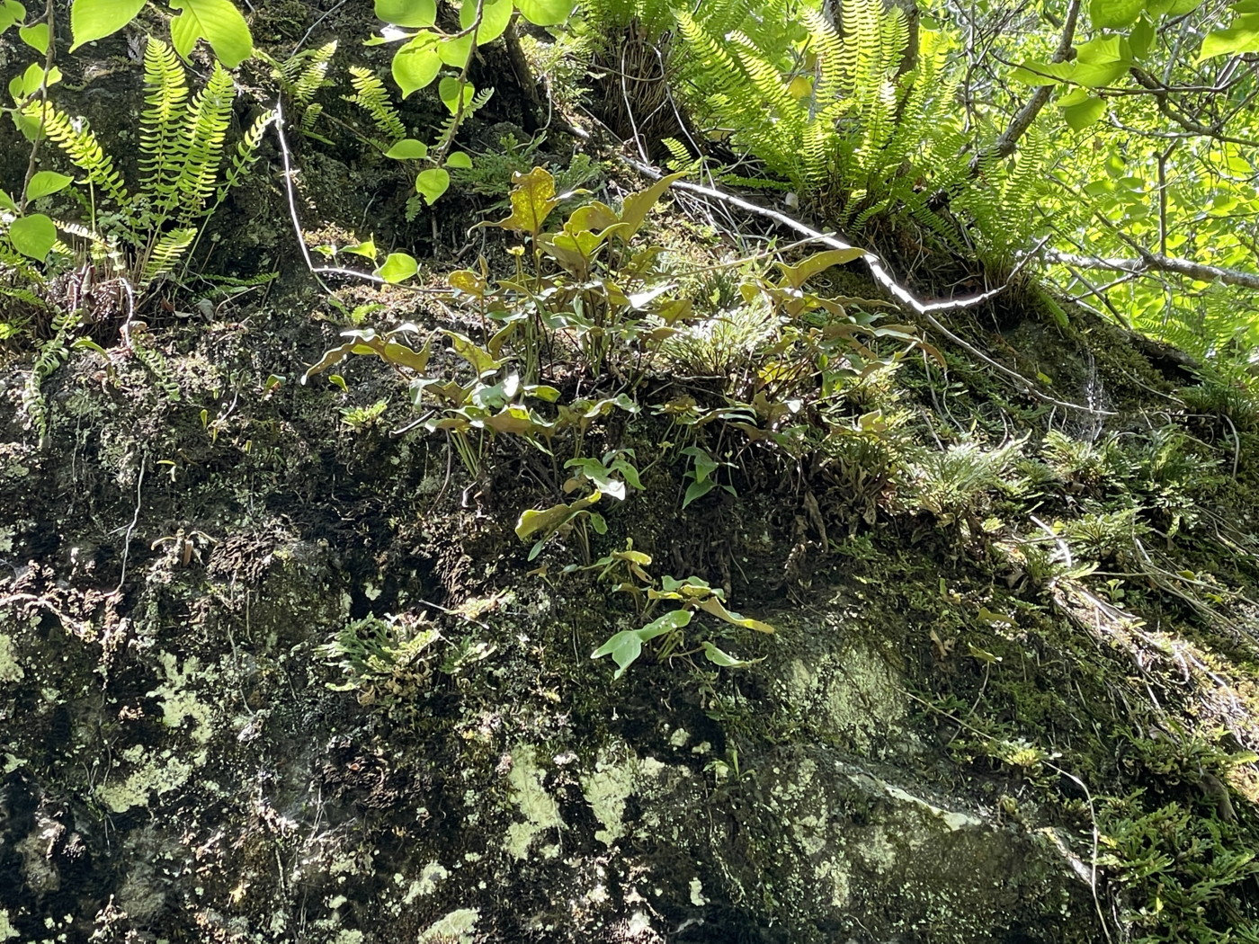 この辺りに広く点在して生育。クモノスシダ同様好石灰岩性のシダ。玄武岩質中心の付加体の中に石灰岩質がわずかでも含まれているのでしょうか。