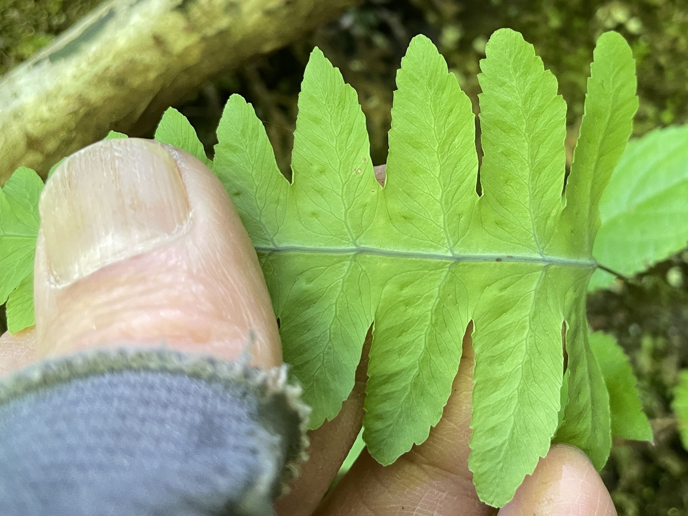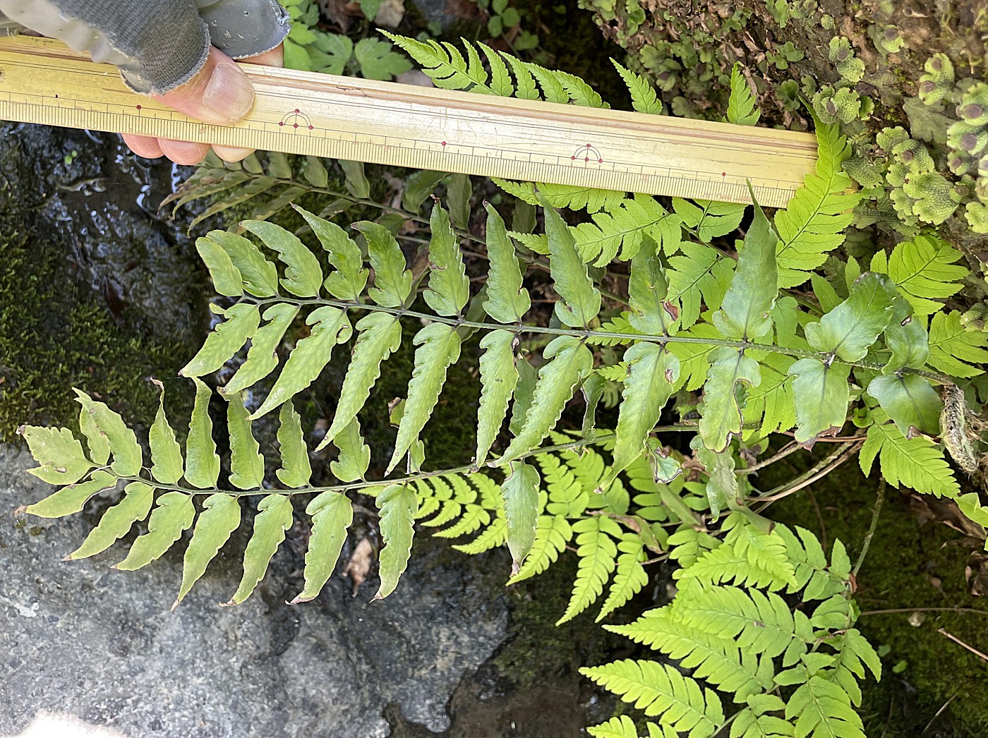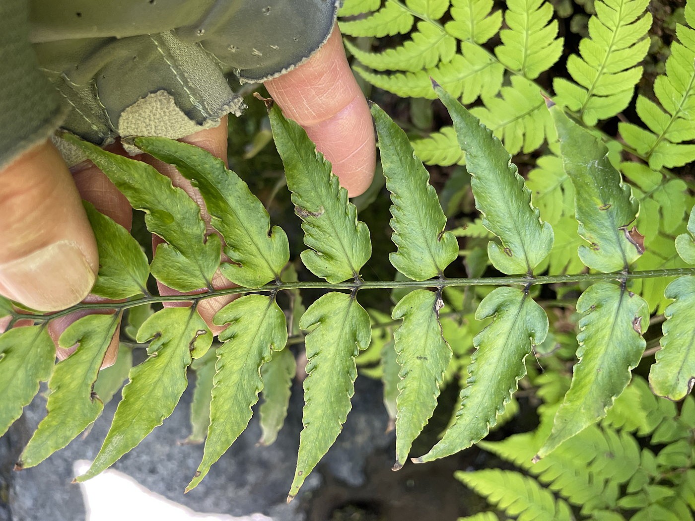 渓流の流れのそばの岩割れ目に生育。テリハヤブソテツの個体変異か。