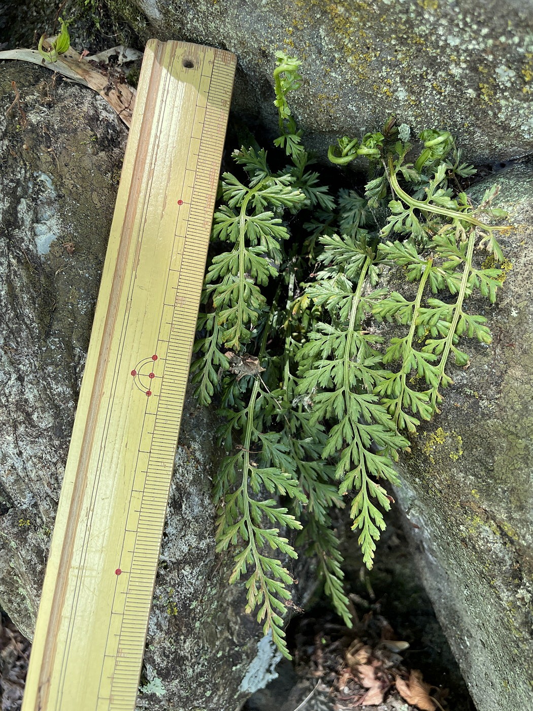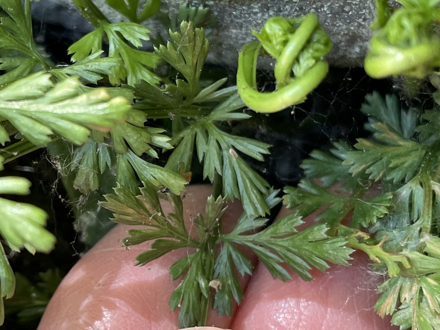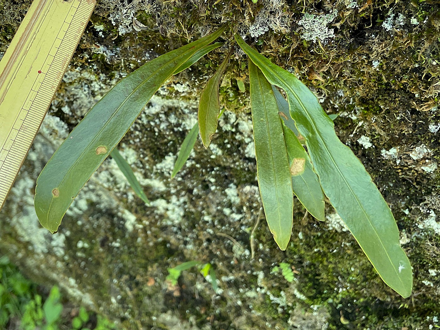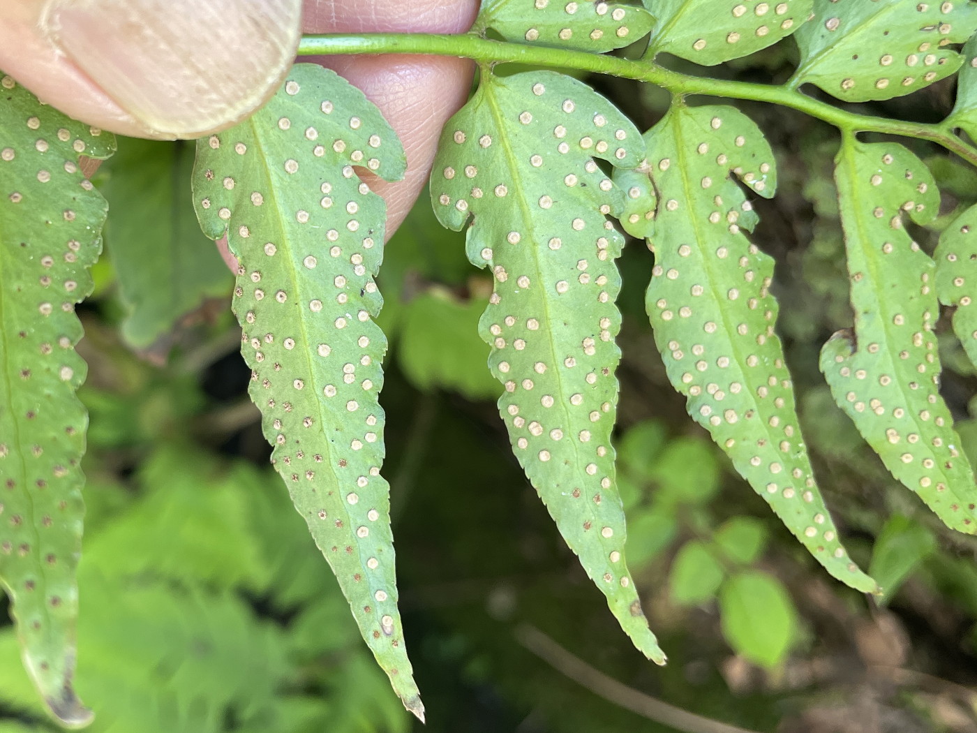 渓流の流れのそばの岩割れ目に生育。テリハヤブソテツの個体変異か。