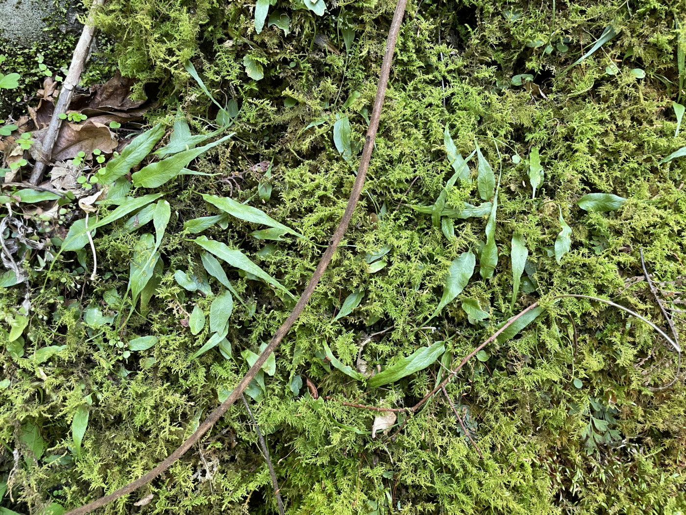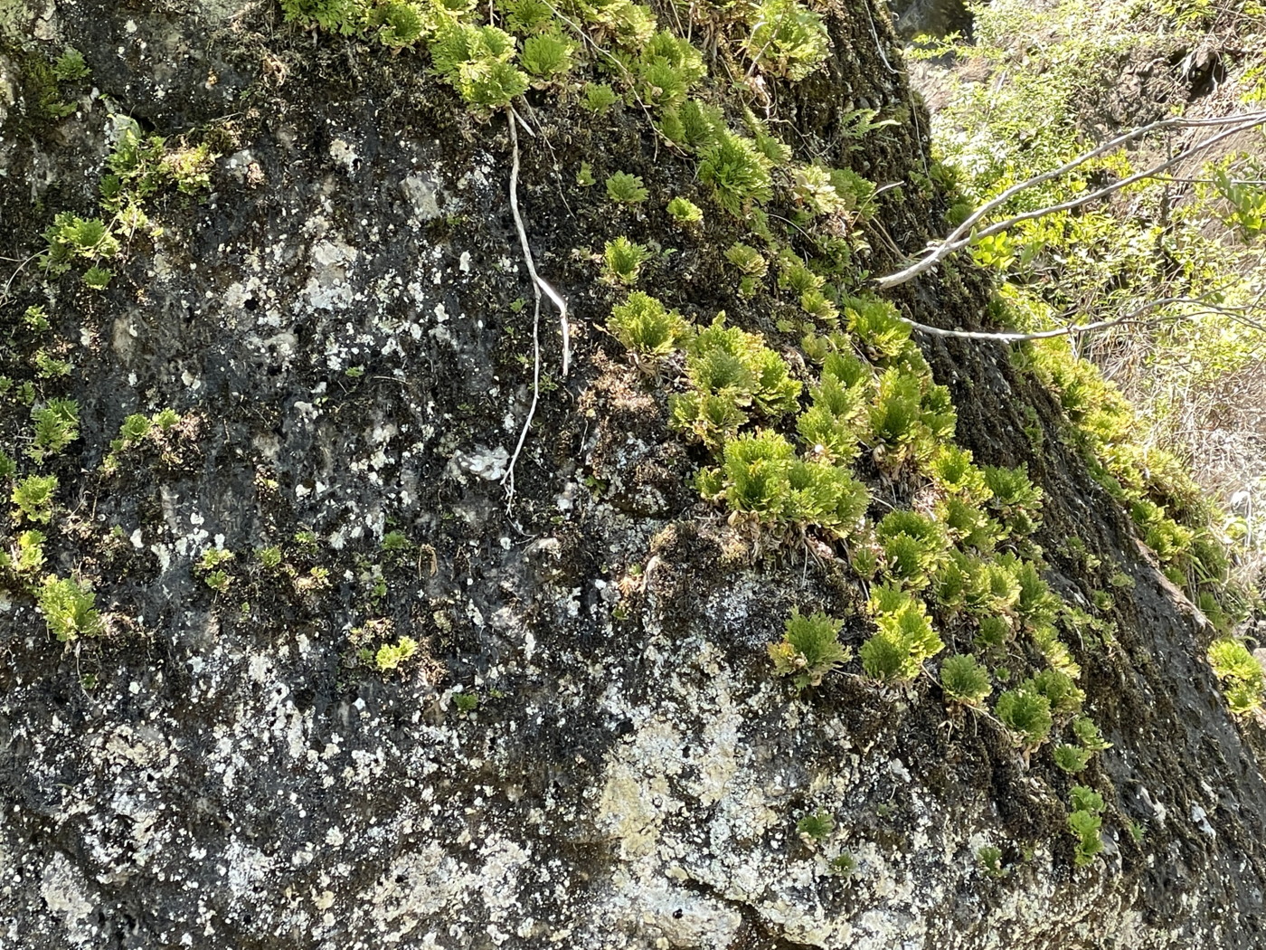 林内、脆い玄武岩質の崖に数株が生育。それほど多くない。季節が早いせいかまだ胞子のう群は確認できなかった。