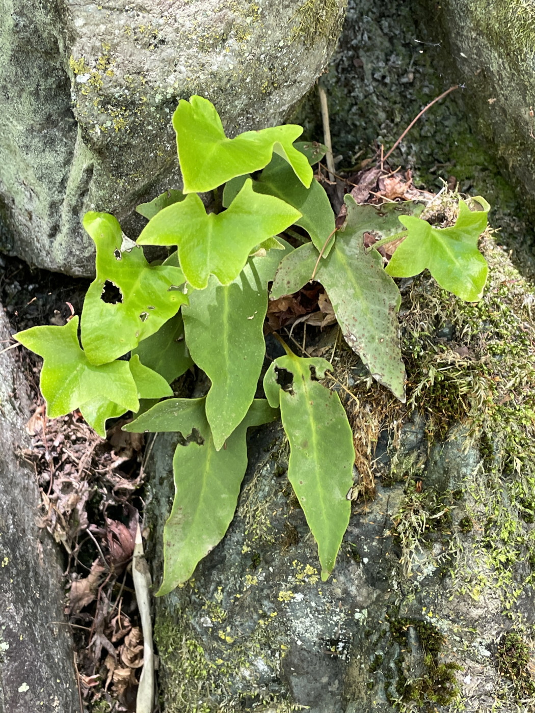 苔むした玄武岩質の岩壁や石組みに群生。ときどき目にすることがあった。付加体の玄武岩地帯には石灰岩が付随することもあり、クモノスシダが生育しやすい環境が生じるのかもしれない。