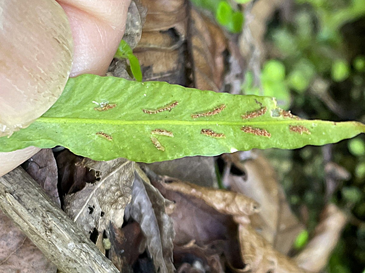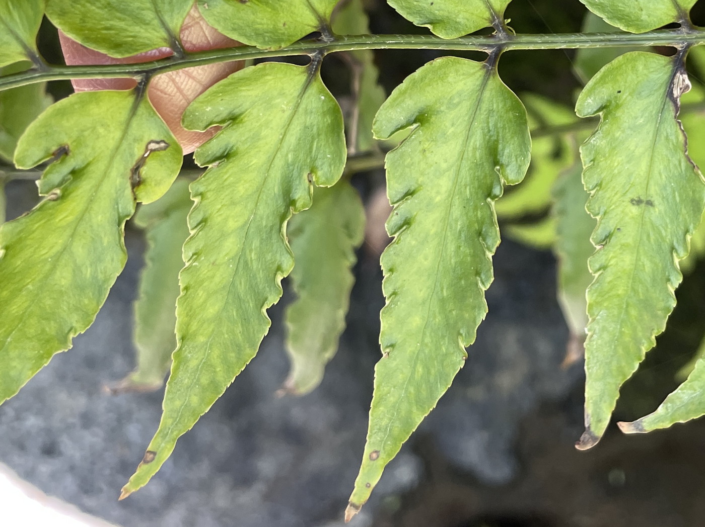 ②羽片が切れ込むテリハヤブソテツ、葉身下部